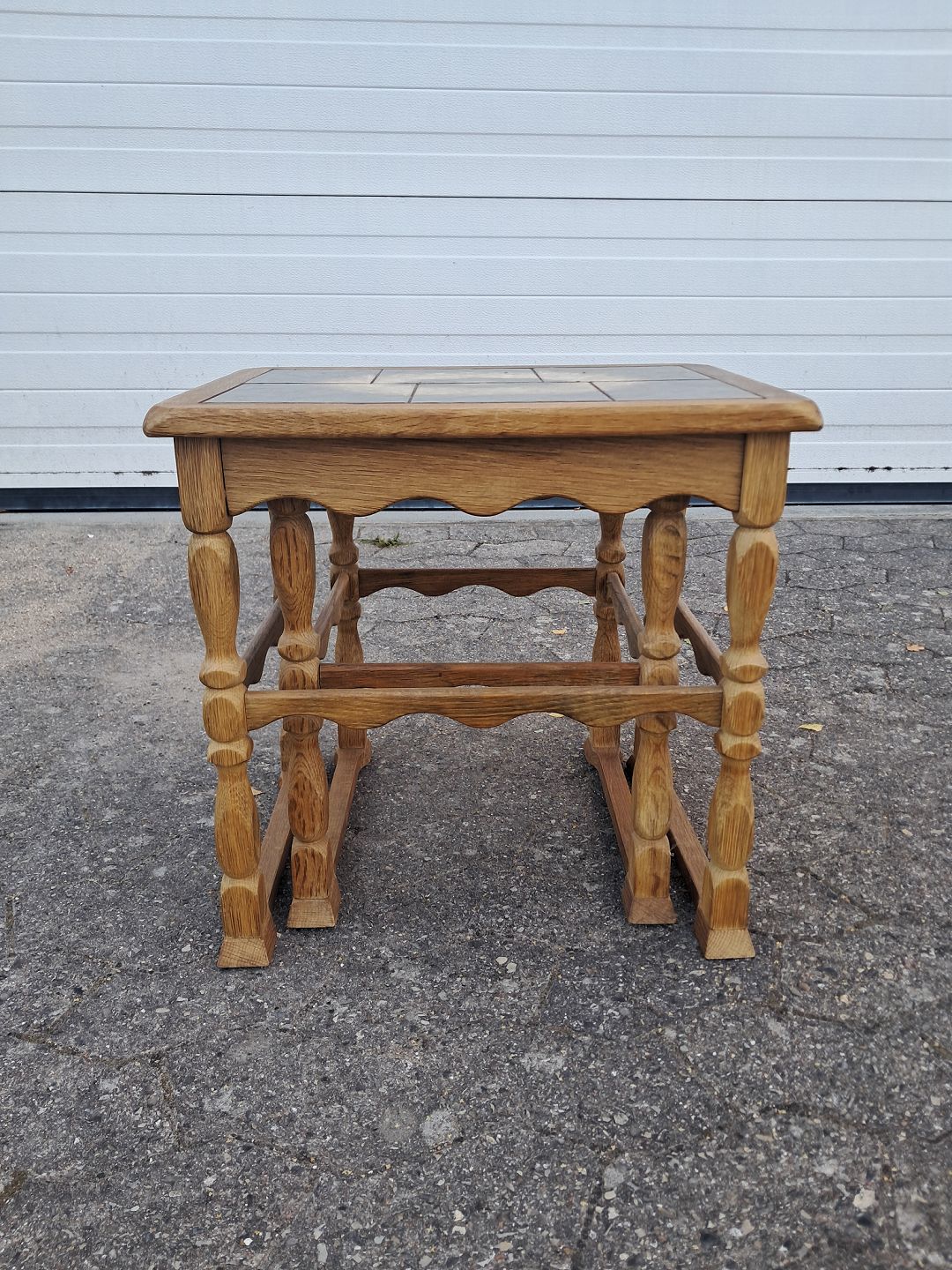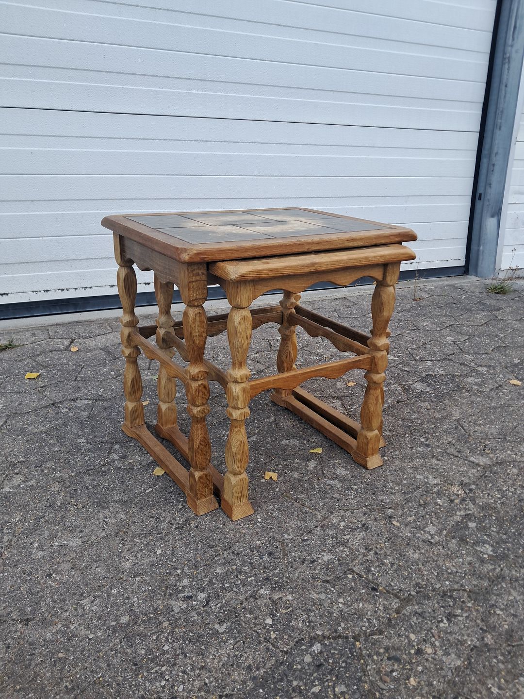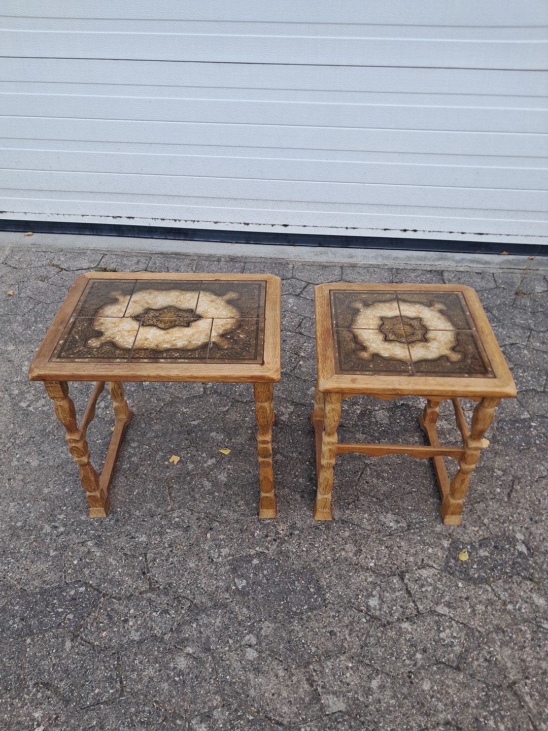 2 Borde i massivt egetræ og kakler, fra 1980erne.