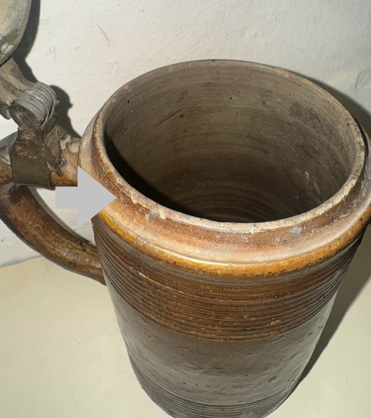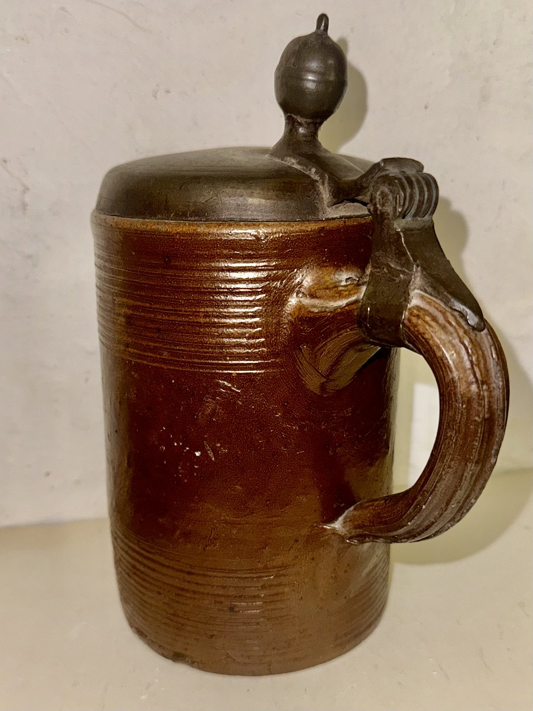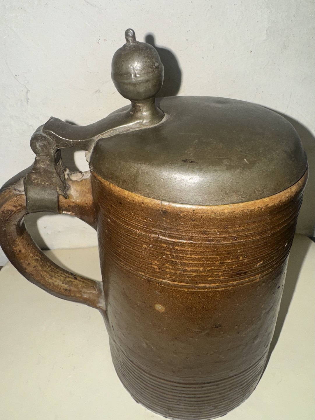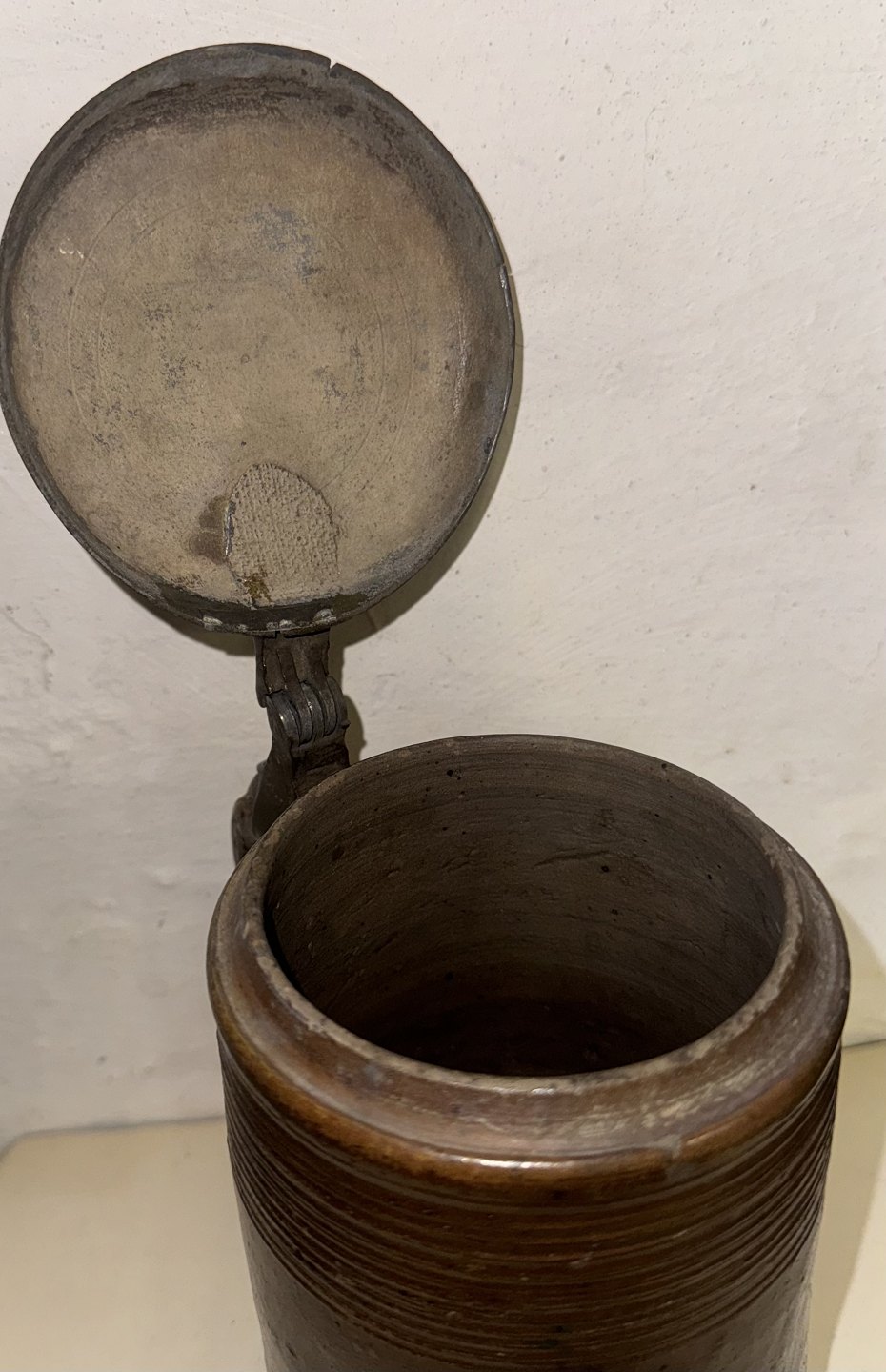 Ceramic mug with metal lid. Made in Germany in the first half of the 19th century. The mug has some signs of wear (see photos with the gray arrows). Measures: 15.5 cm and 21.5 cm included the top of the lid.