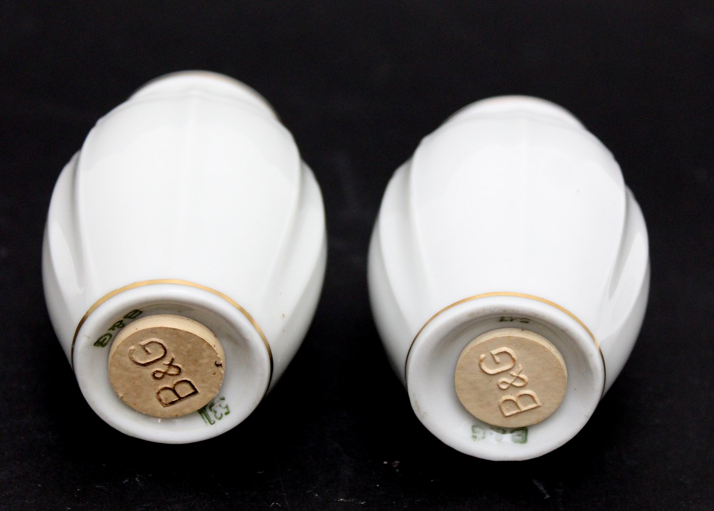 Bing & Grøndahl, Offenbach, Salt og Peber sæt. Hvidt kantet porcelæn med guld. Højde 7,5 cm. Salt og peber med original B&G propper. Pris: 375 kr. for sættet.