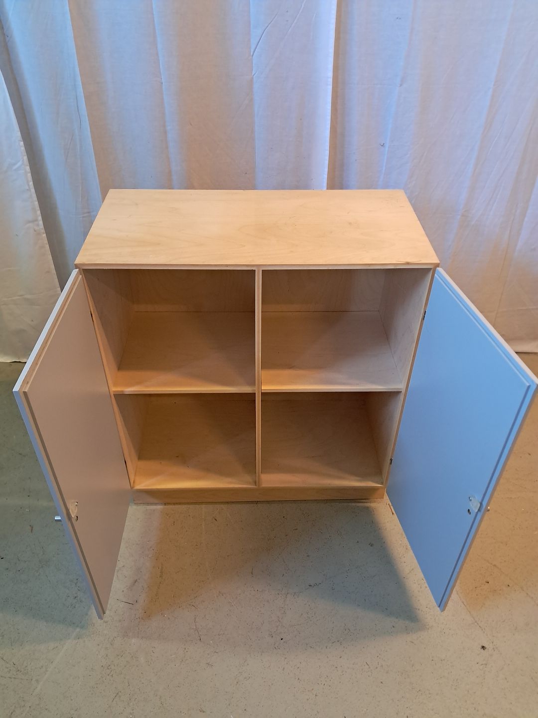 At-bo reolkasse i krydsfiner med malede låger, fra 2000erne.