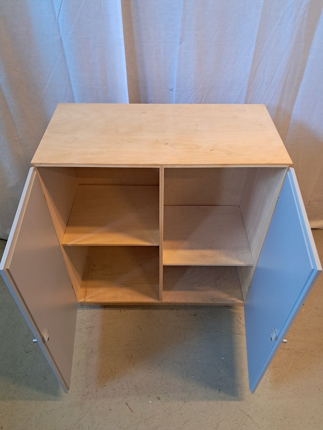 At-bo reolkasse i krydsfiner med malede låger, fra 2000erne.