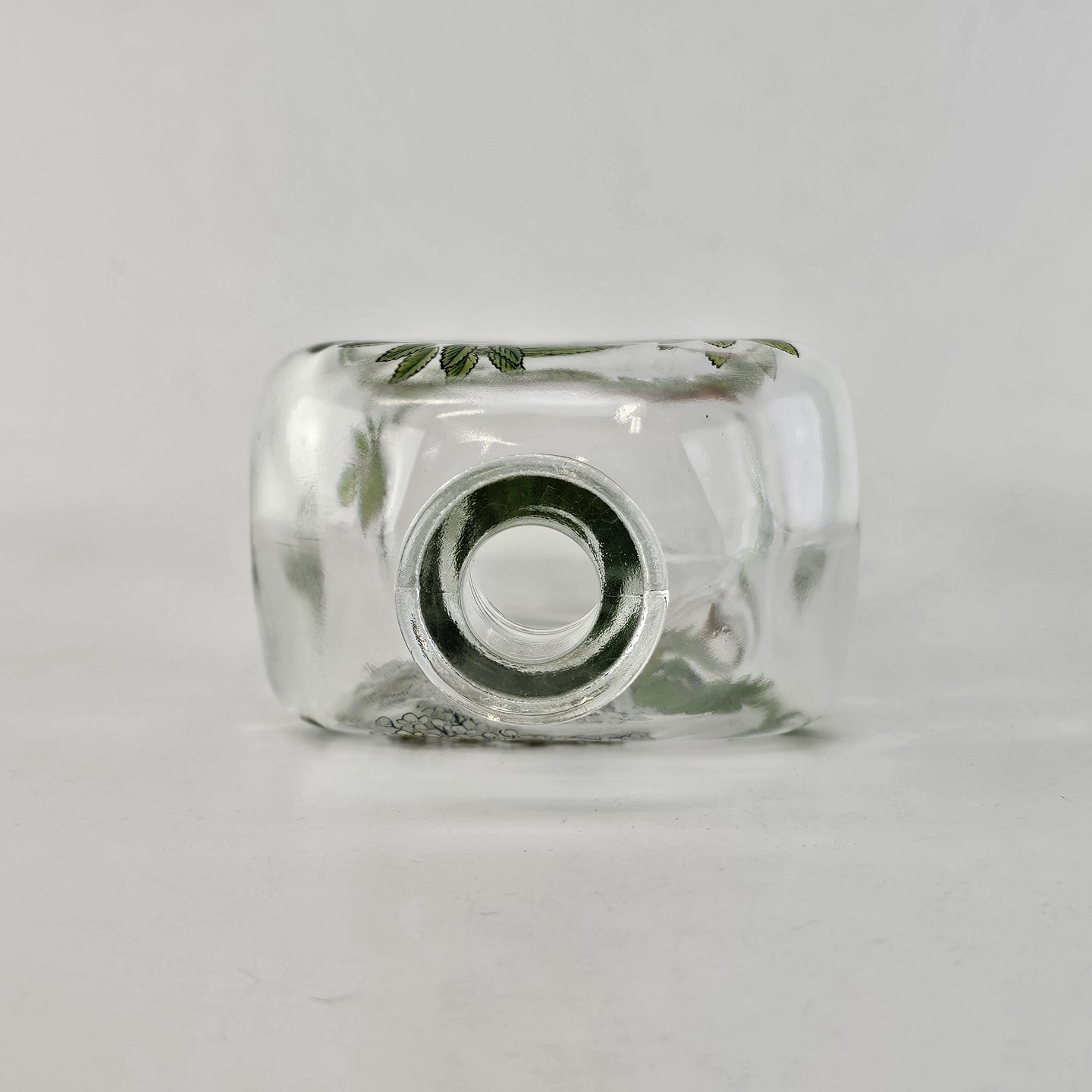 Text available in Danish: Karaffel i klart glas med korkprop fra serien Brændevins Amatøren, dekoreret med en gren af rønnebær og teksten Sorbus Aucuparia L.