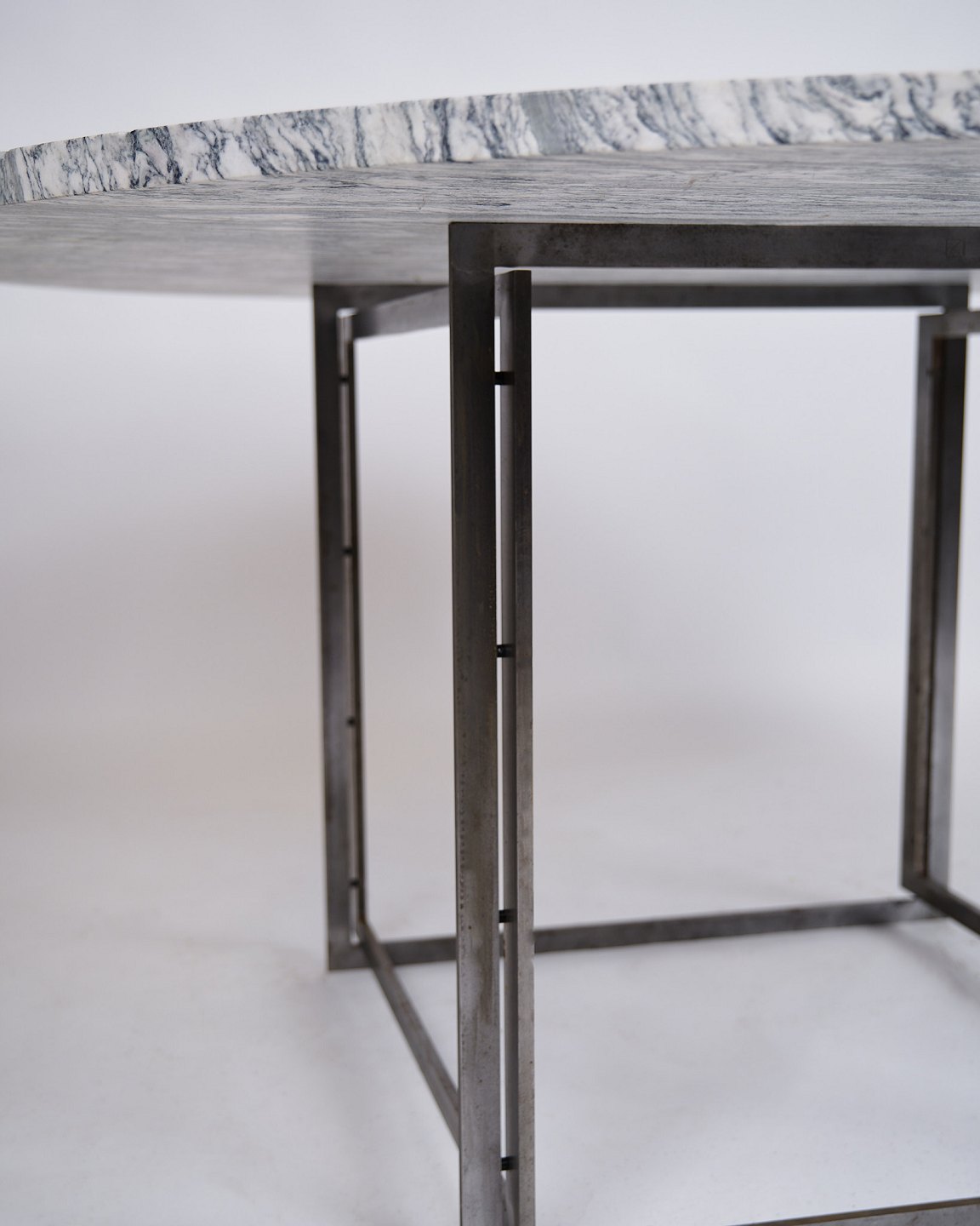 Rare dining table, model PK54, designed by Poul Kjærholm and produced by E. Kold Christensen in the 1960s. The table is made with a solid round cipollini marble top, supported by a steel frame, characteristic of Kjærholm's minimalist design.