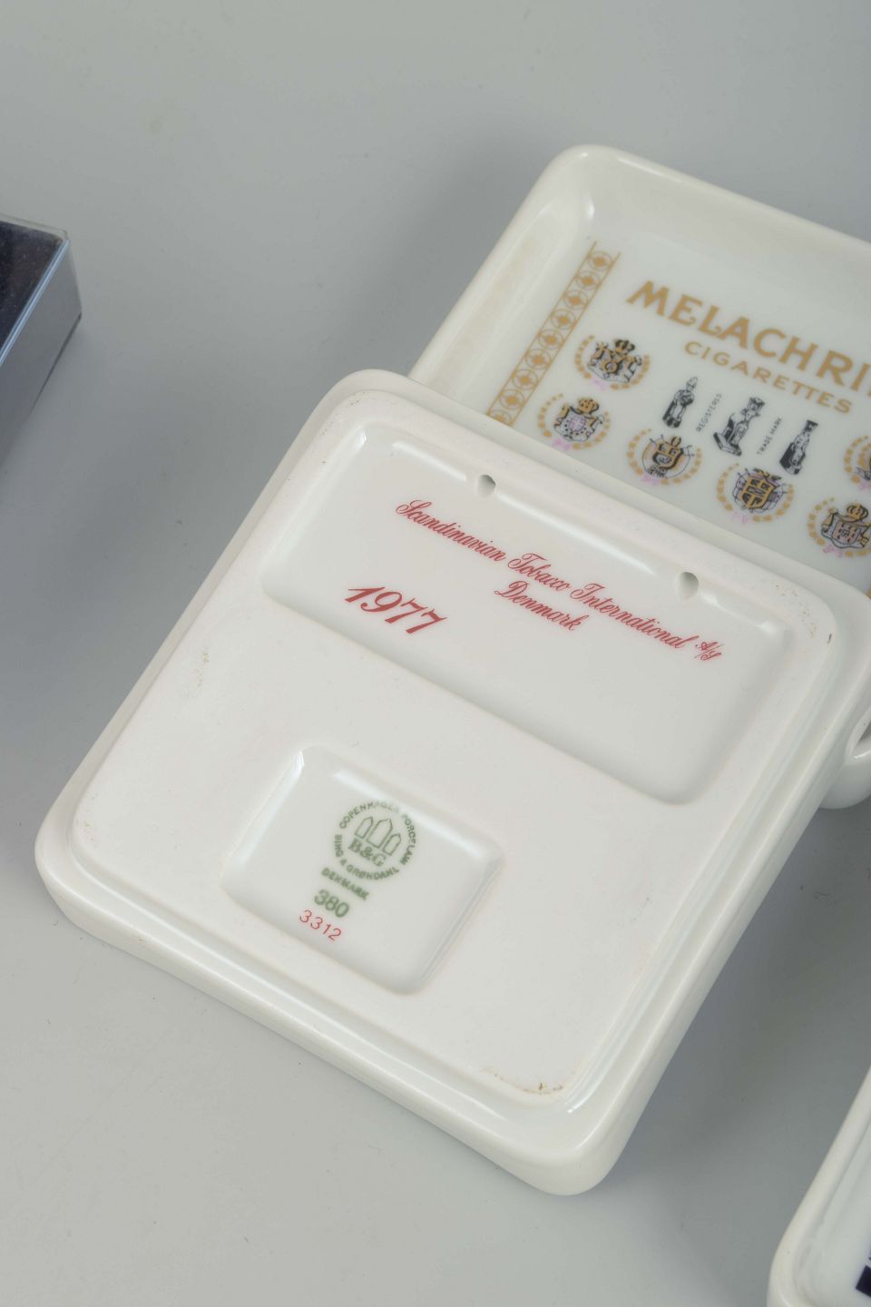 Bing & Grøndahl, grundlagt i København i 1853, er kendt for sit fine porcelæn og sine populære samlerobjekter. I 1980’erne producerede fabrikken også små serier af dekorative brugsgenstande, herunder askebægre med reklame- og tobaksdekorationer. Disse fire eksemplarer afspejler både porcelænskunstens kvalitet og tidens grafiske udtryk. Efter fusionen med Den Kongelige Porcelænsfabrik i 1987 blev Bing & Grøndahl en del af Royal Copenhagen, hvilket gør sådanne genstande til særligt interessante samlerobjekter i dag.
