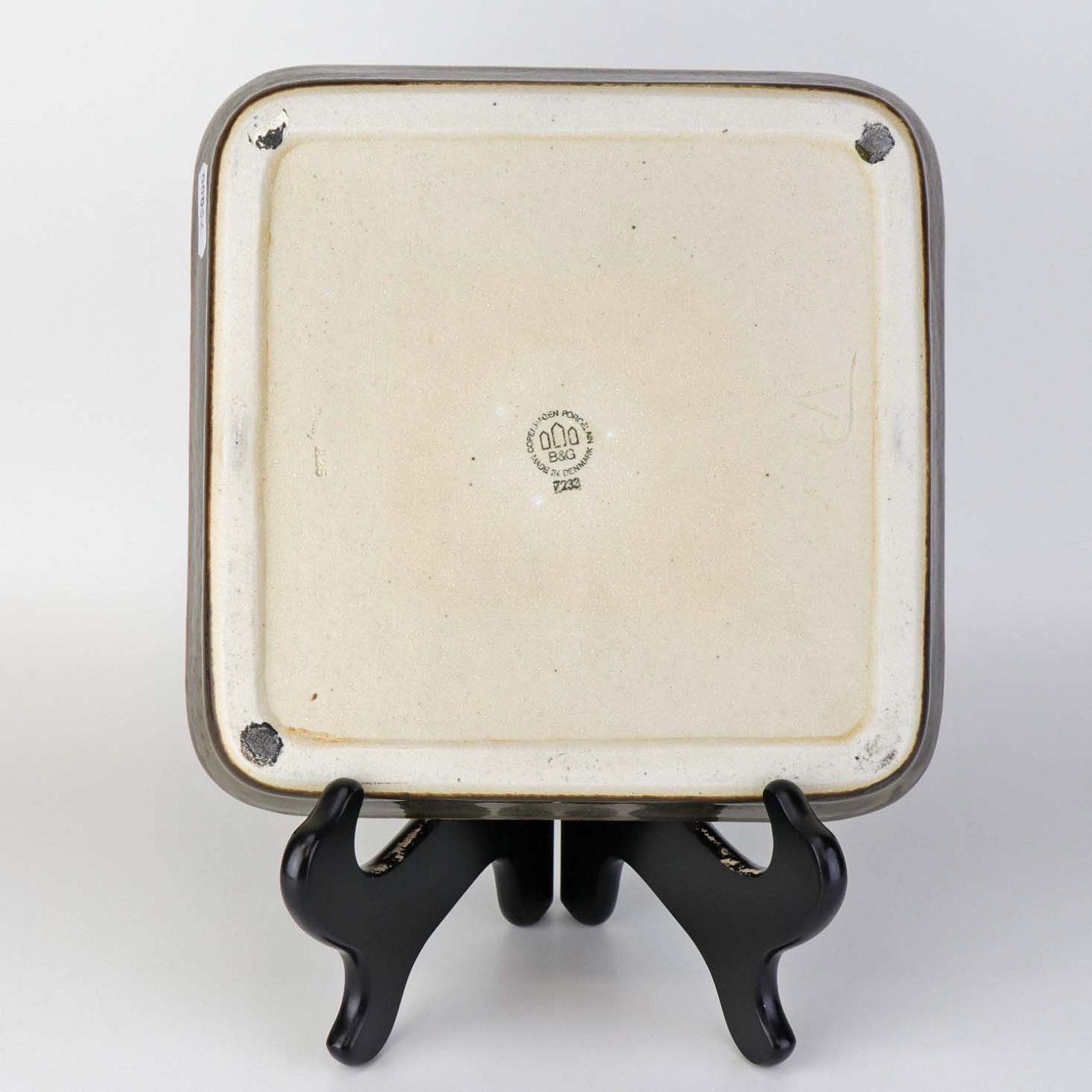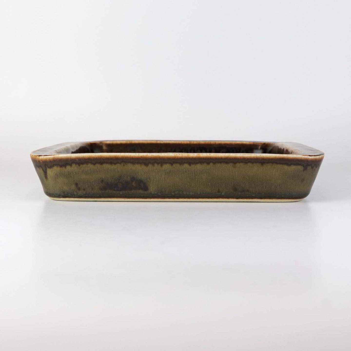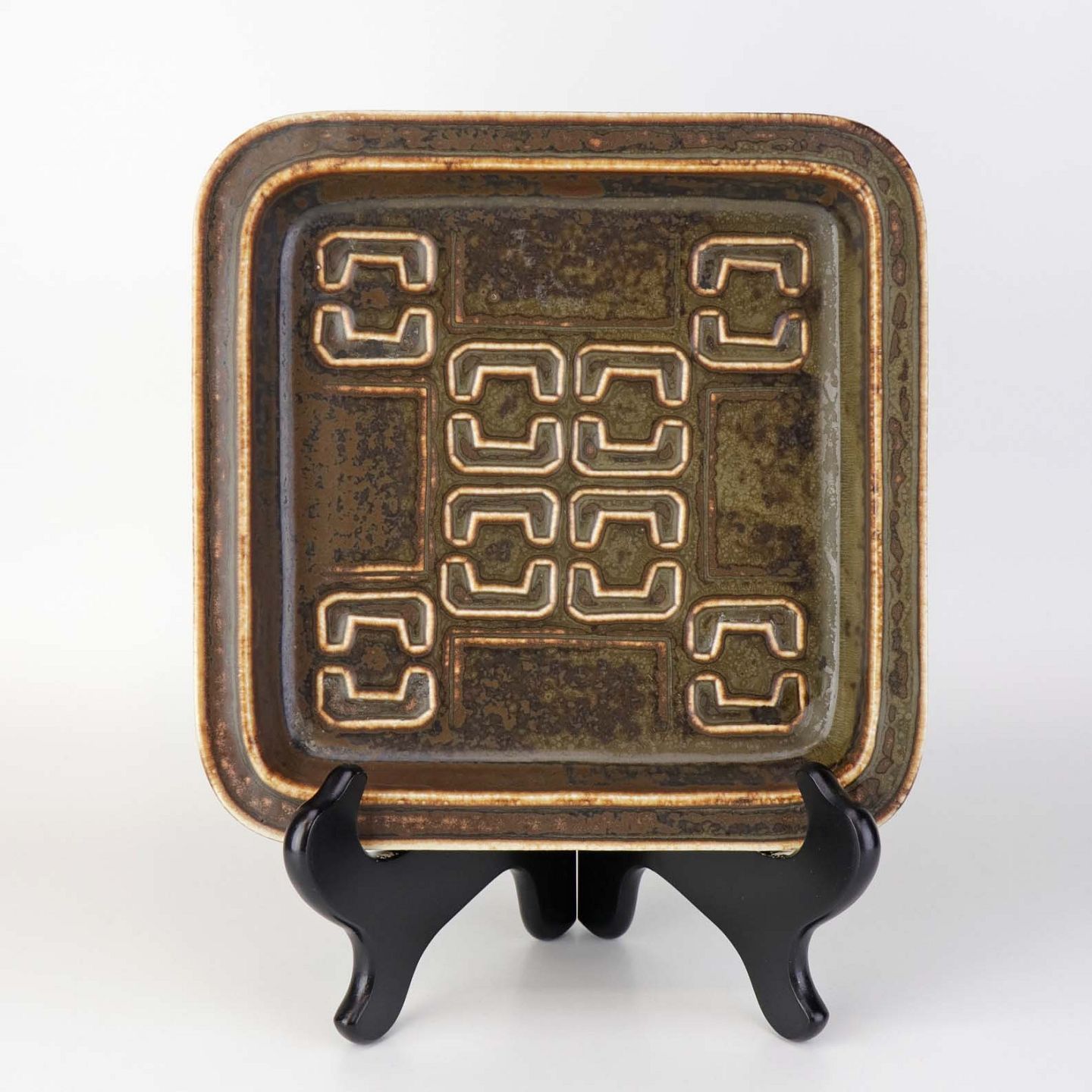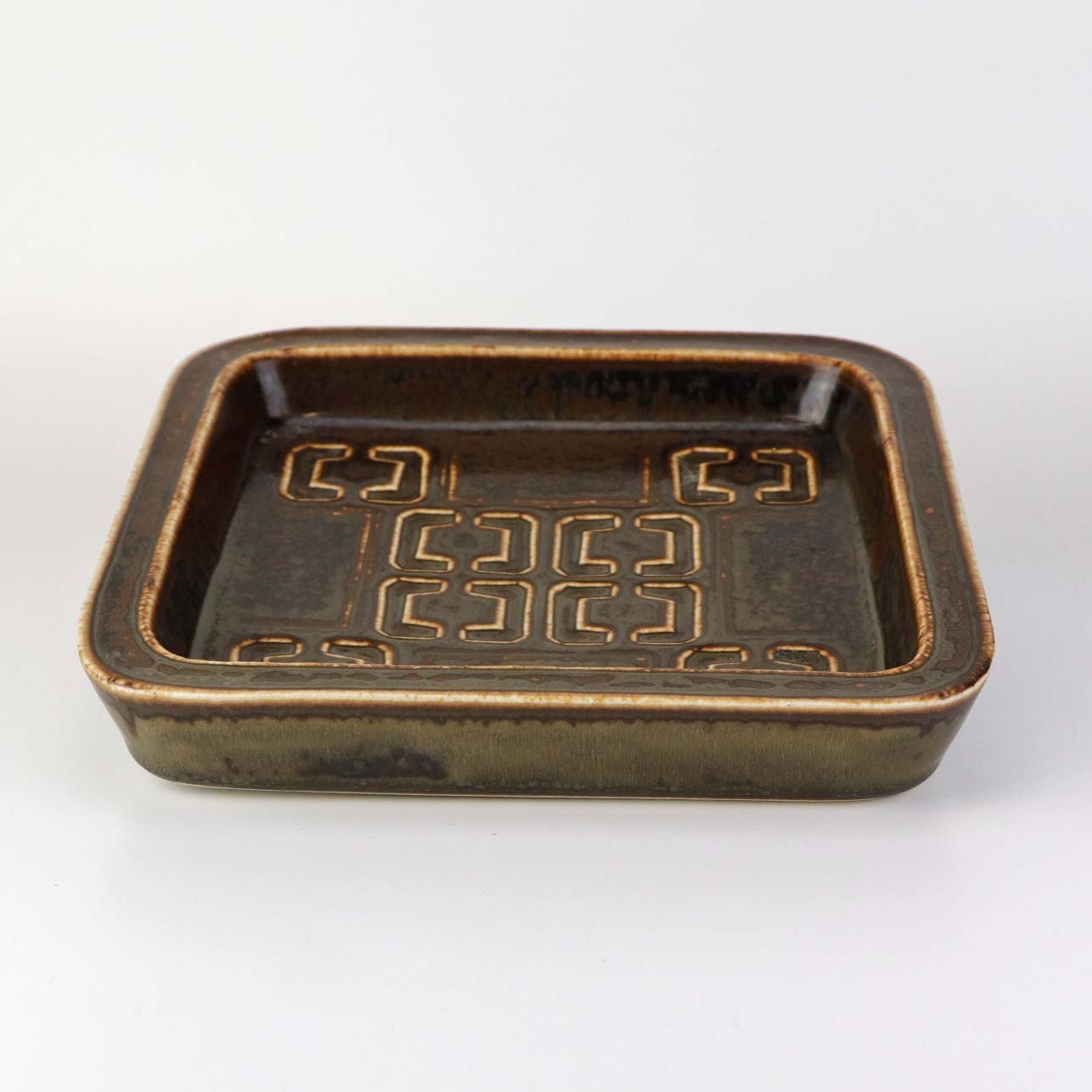 Firkantet bordfad i stentøj med brun glasur og geometrisk motiv. Nr. 7233
