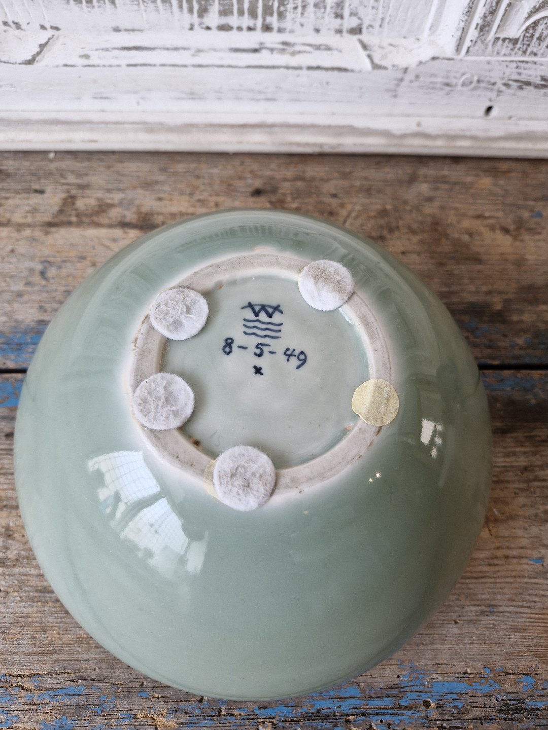 Text zugänglich auf Dänische: Bode Willumsen for Royal Copenhagen stor unika skål i smuk grøn glasur fra 1949