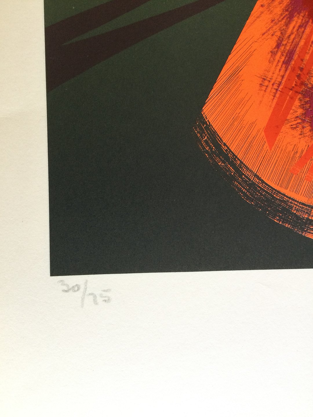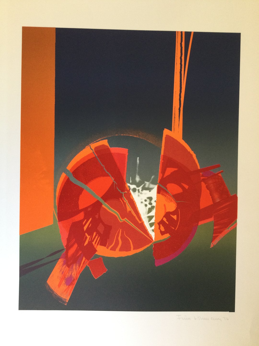 Text available in Danish: Farvelitografi af Finn Lohmann - Komposition 1976.