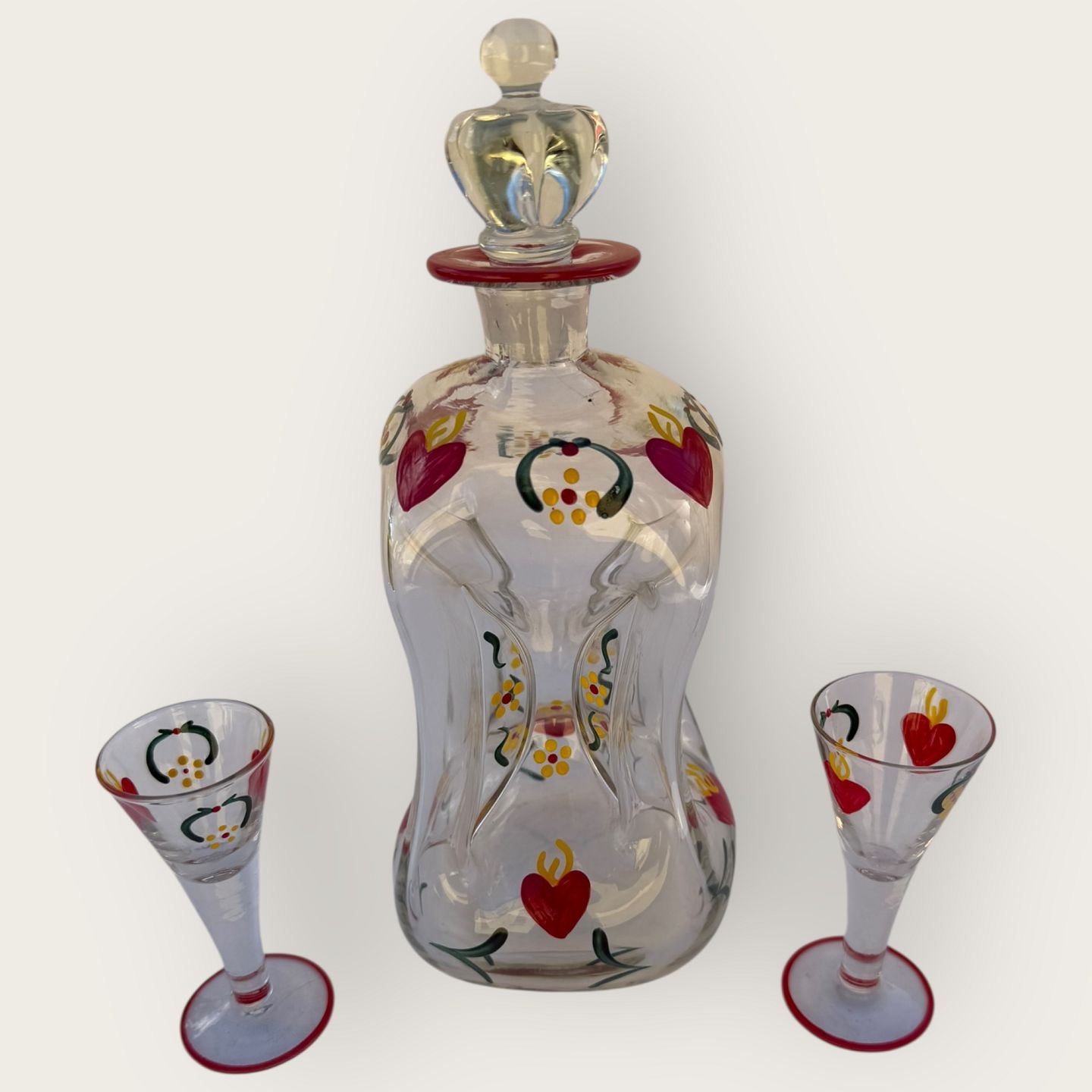 Holmegaard, Painted kluk bottle with crown stopper and 2 glasses, decorated with red hearts etc.; Height 25cm, height schnapps glass 10cm