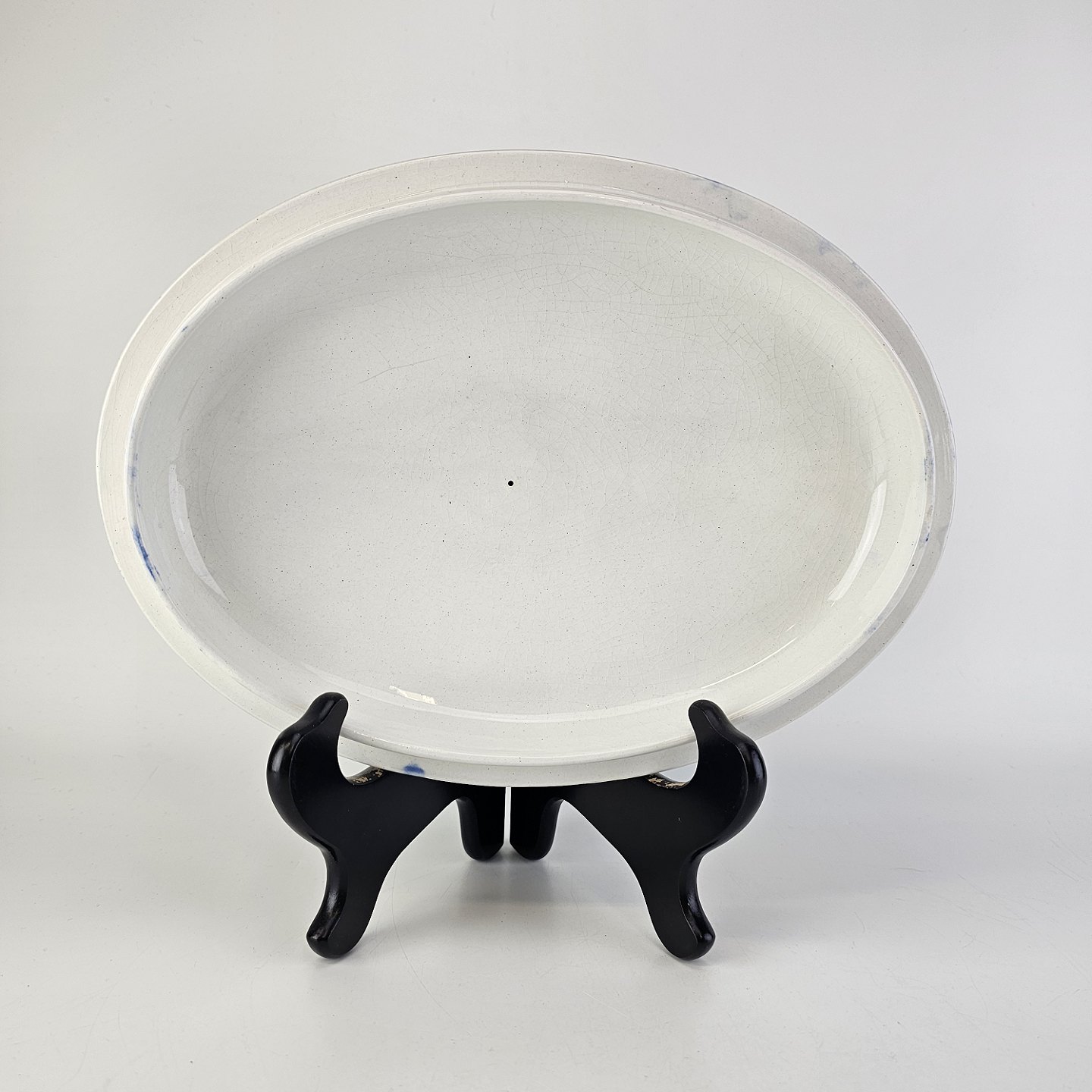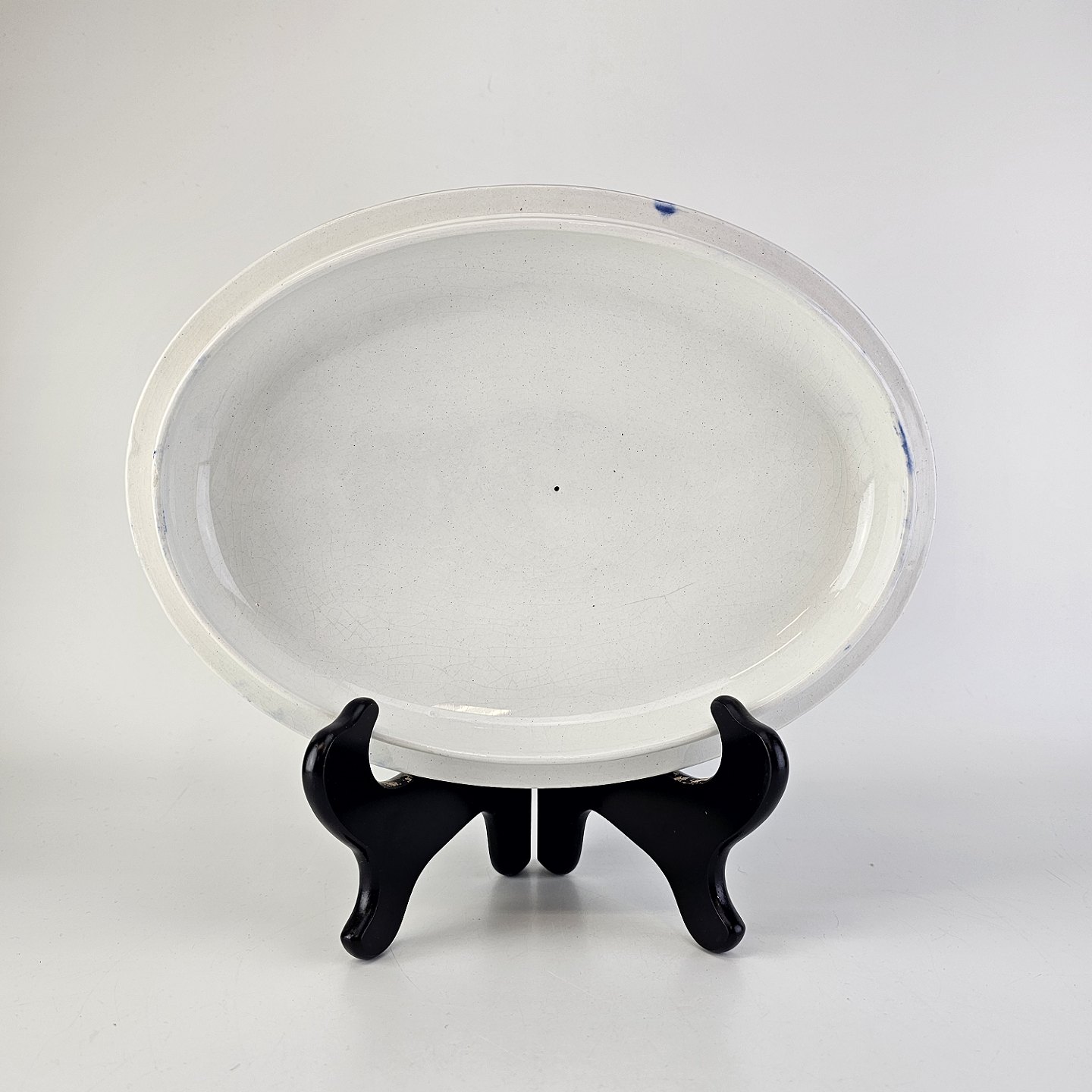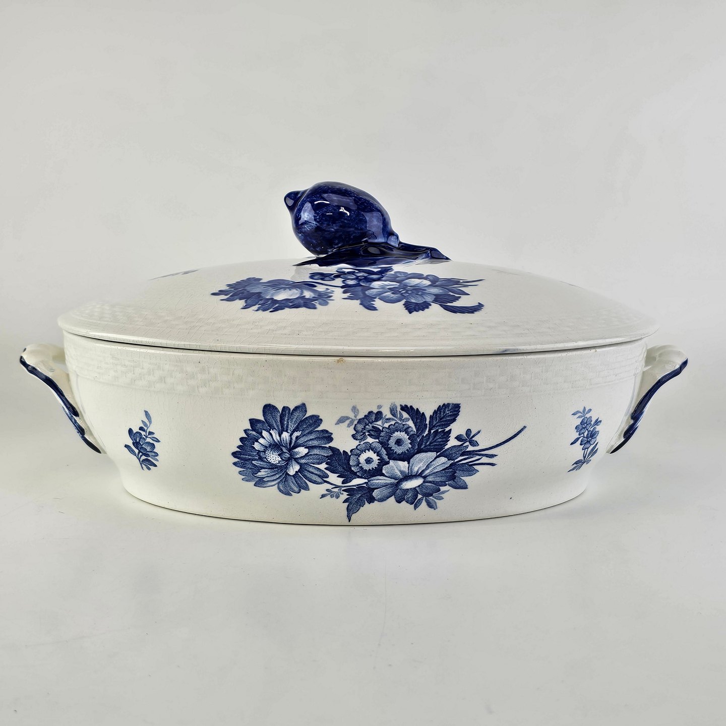 Stel i glat hvid fajance med dekoration af blå blomster og flettet kant