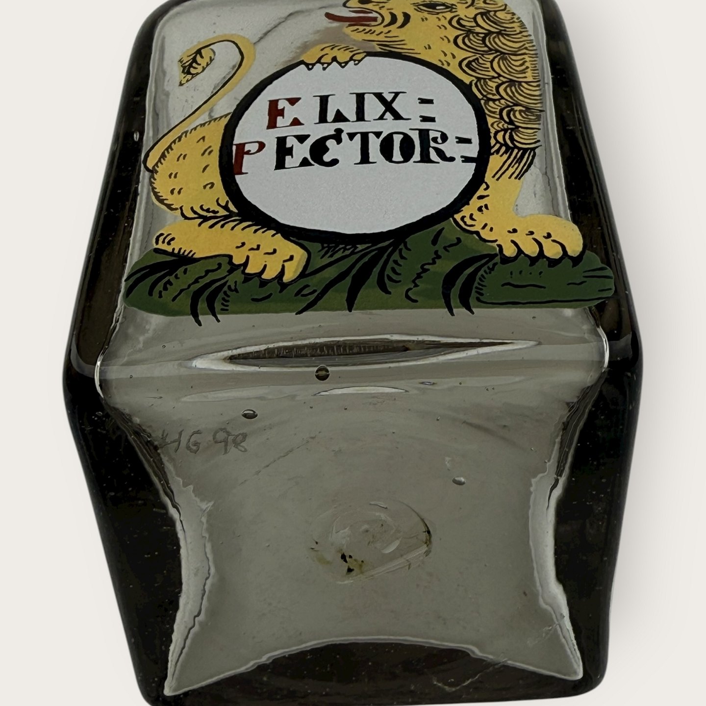 Holmegaard apotekerflaske fra 1998, Elixpector, Mål: 10x6x6cm, flaskerne er mundblæste kopier af originale gamle apotekerflasker, Signeret Hg98.