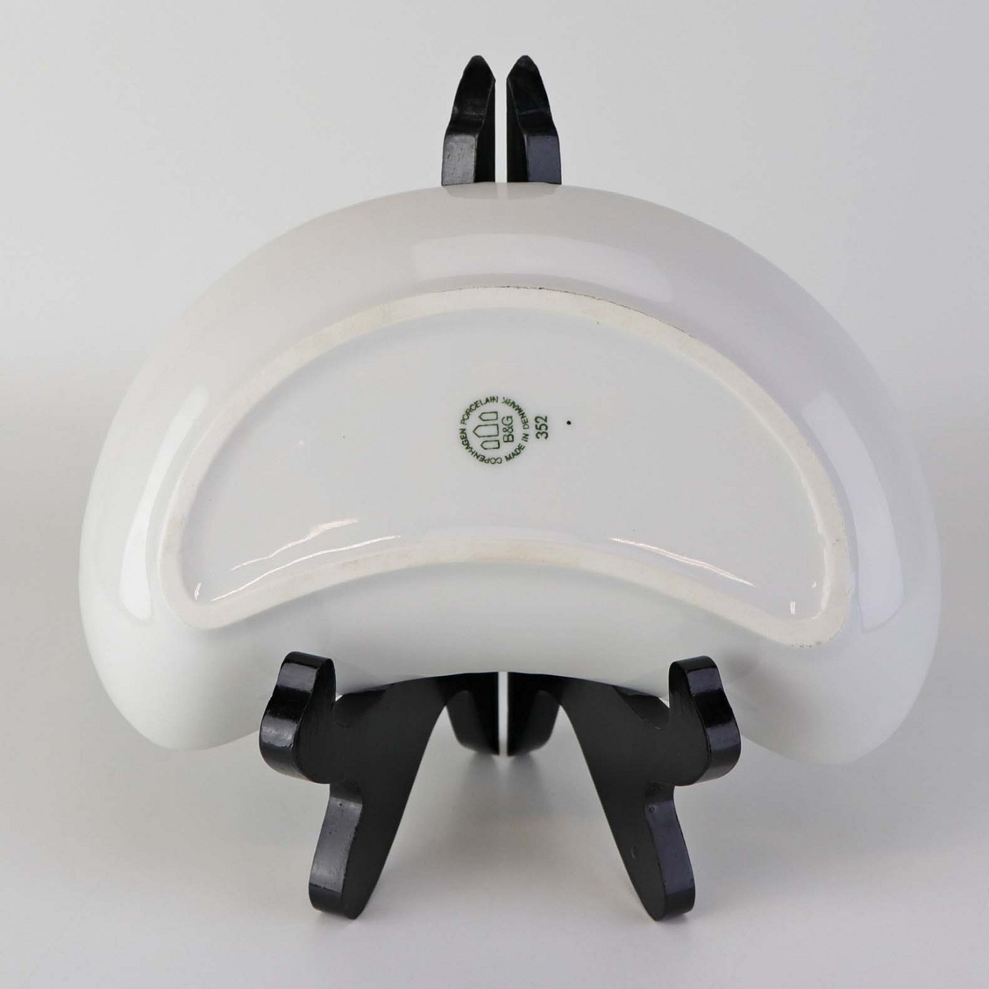 Halvmåneformet fad i porcelæn fra stellet Klitrose. Nr. 352