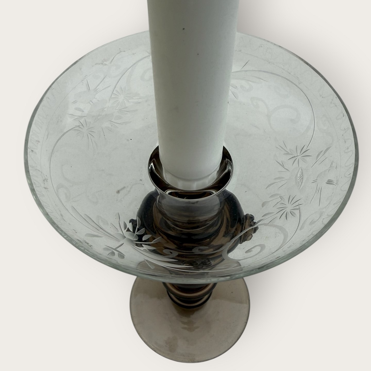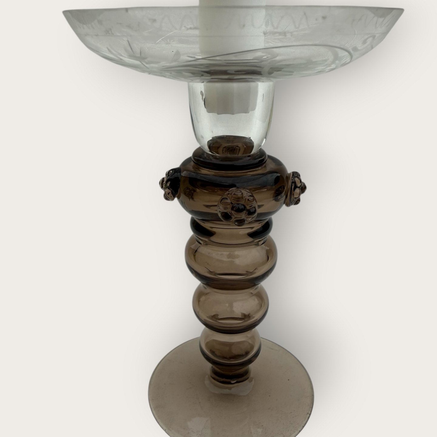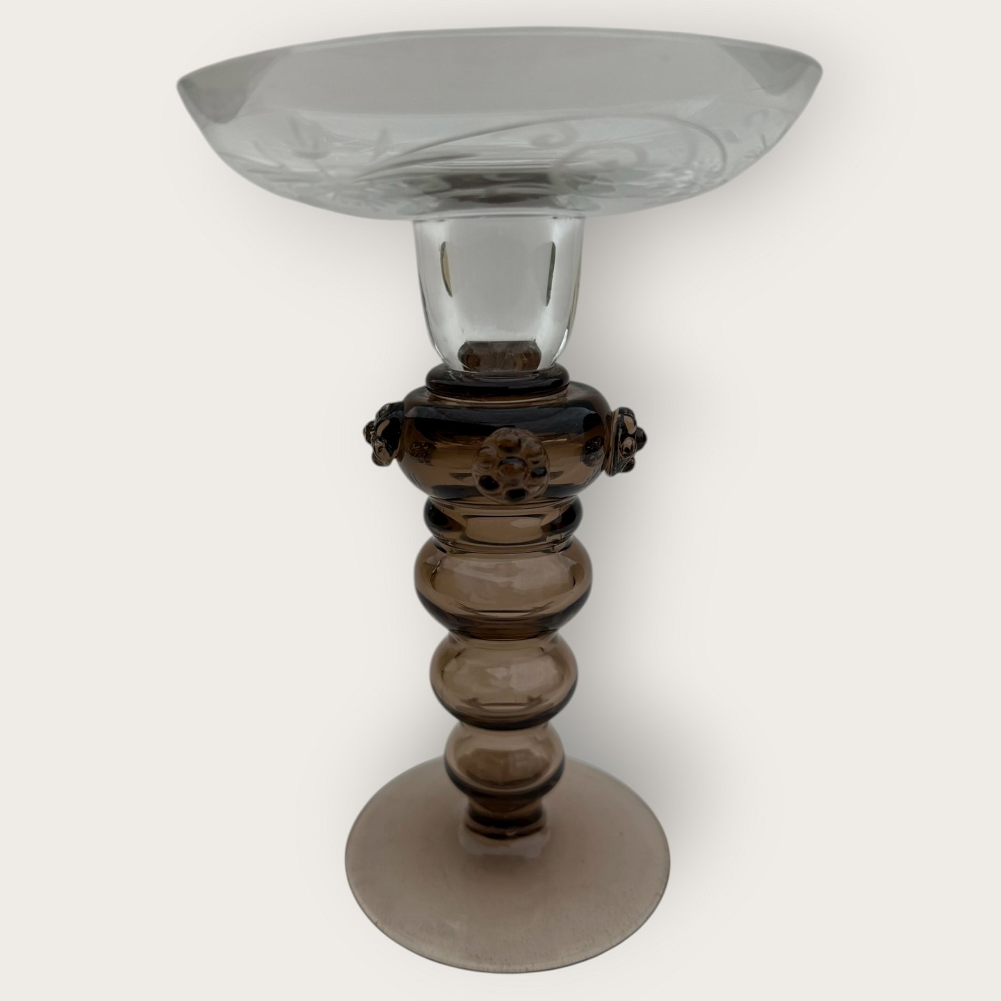 | Gammel glaslysestage, hul brun stamme med rosetter, Skål med slibninger affugle, mønster og blomster, flot stand, højde 16,5cm, diameter 11cm