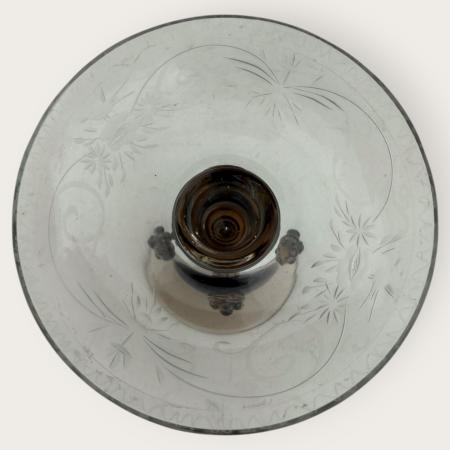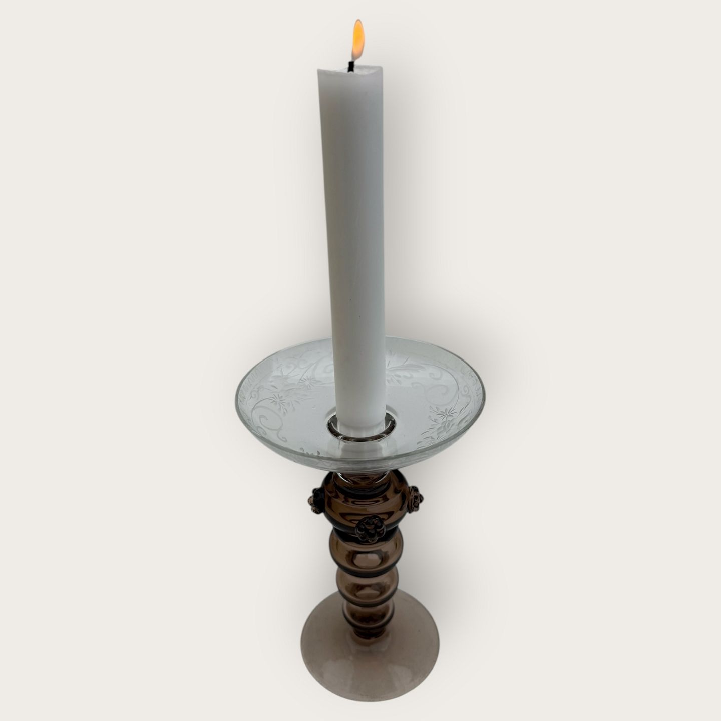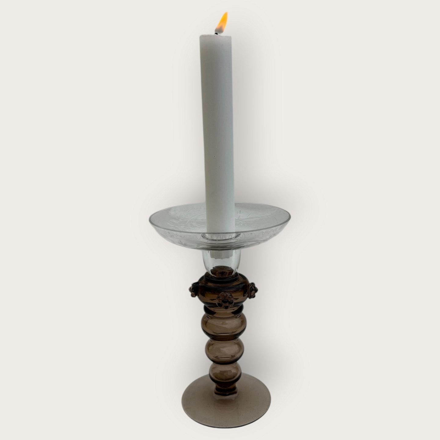 | Gammel glaslysestage, hul brun stamme med rosetter, Skål med slibninger affugle, mønster og blomster, flot stand, højde 16,5cm, diameter 11cm