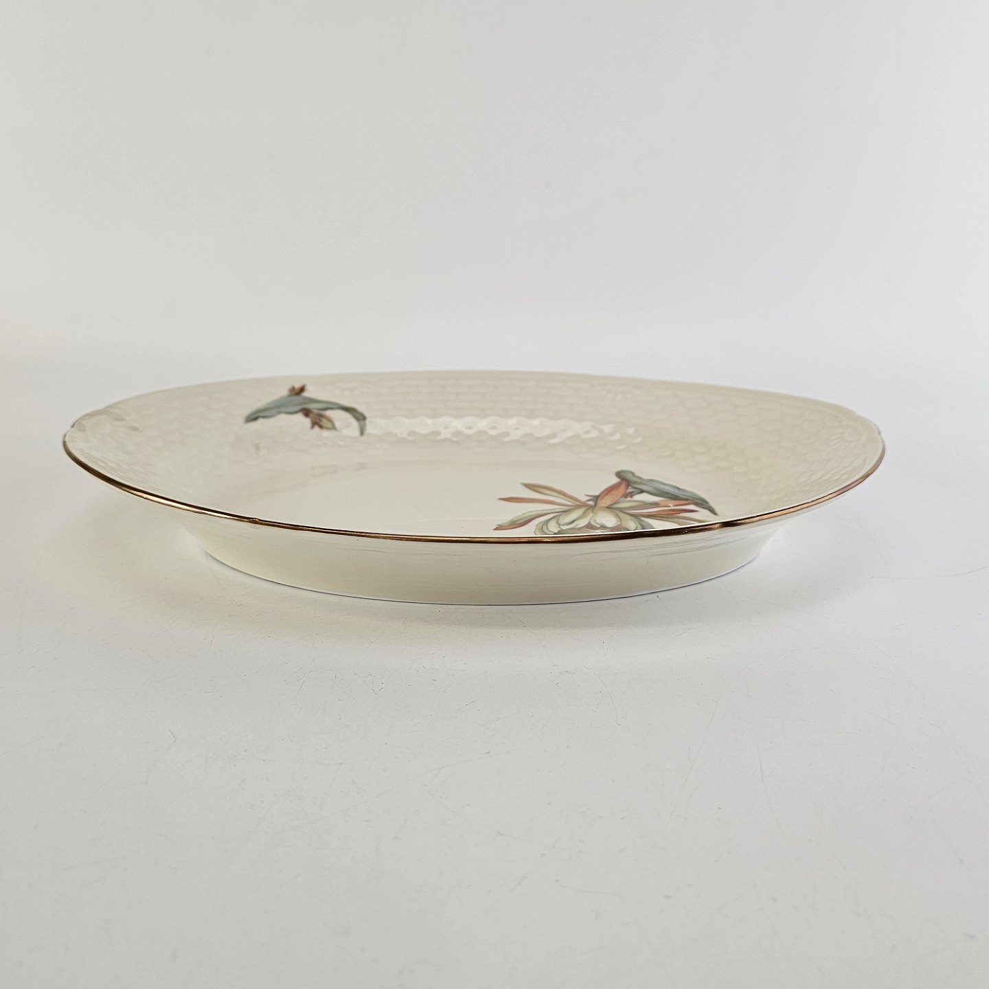Kaktus er cremefarvet porcelæn i skælform, dekoreret med kaktusblomster og guldkant