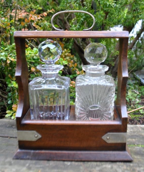 Tantalus af egetræ med to forskellige karafler af krystal med propper. England. 19. årh