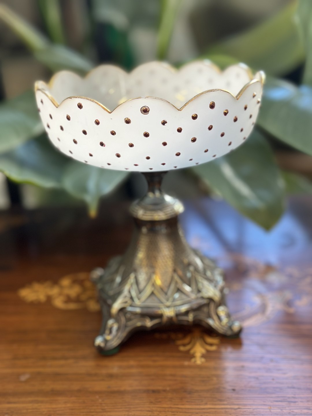 Vintage skål fra 1800 -1900 tallet , skålen er i opalin -glas (mælkehvidt glas ) med håndmalede gyldne prikker og guldkant , foden er i pletsølv med dekorative art nouveau - barokinspirerede detaljer , designet opaline glass fra slut 1800 -tallet