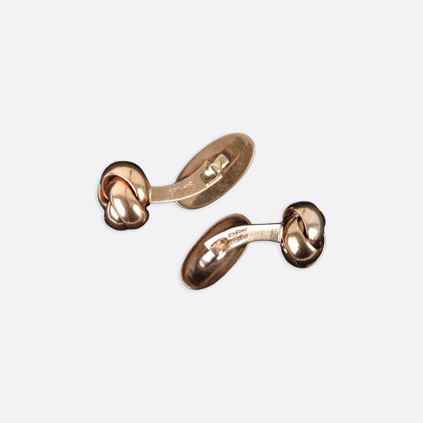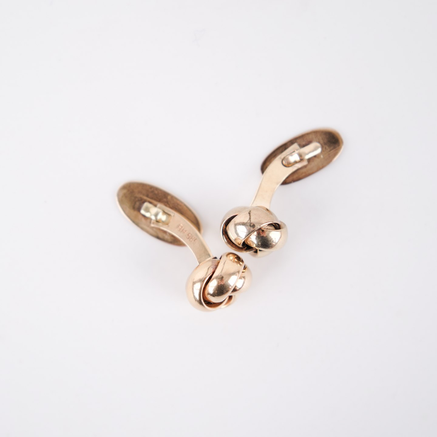 Par manchetknapper i 14 karat guld med dekorativt knudemotiv, fremstillet af Bernhard Hertz i København (1893–1937). Stemplet BH 585 og udført i solidt håndværk med klassisk dansk smykkedesign. Et elegant sæt i ædel kvalitet, velegnet til både samlere og brug i formelle sammenhænge.
