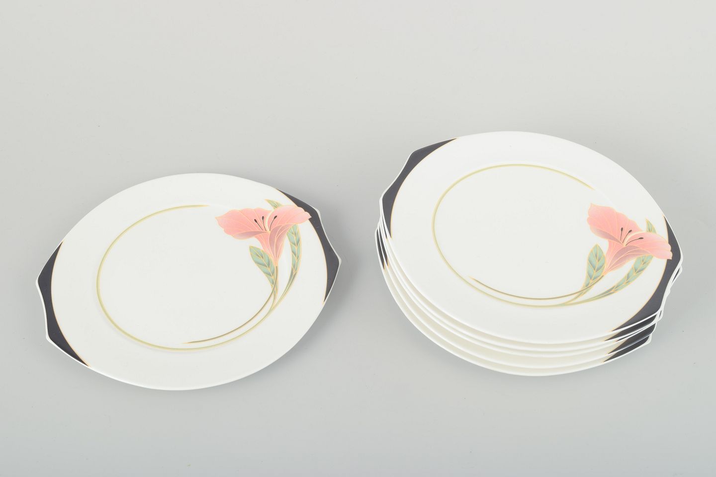 Seks porcelænstallerkener med håndmalet blomsterdekoration i rosa, grønne og sorte nuancer. Serien kombinerer bløde linjer og let asymmetriske detaljer med et elegant postmodernistisk formsprog.