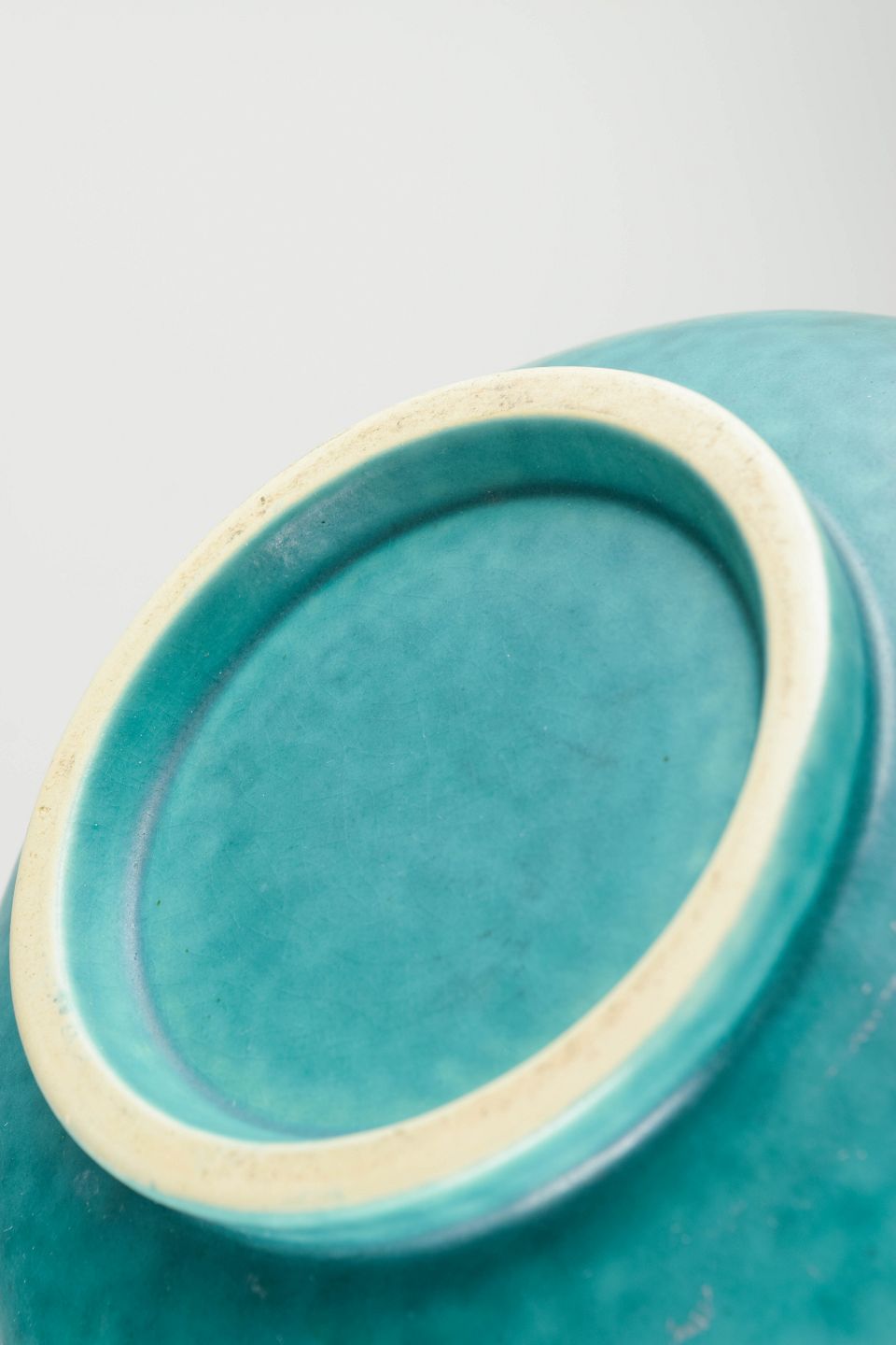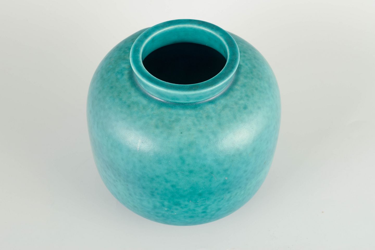 Ustemplet vase i blødt afrundet cylindrisk form med let indtrukket hals og dyb turkis glasur med levende farvespil – typisk for Kåges Azur/Tonan-serie. Elegant og harmonisk art deco-udtryk.