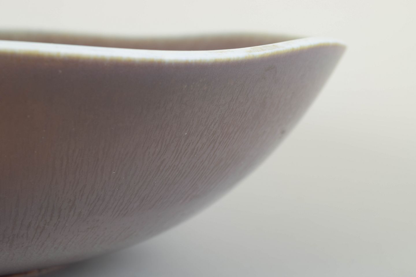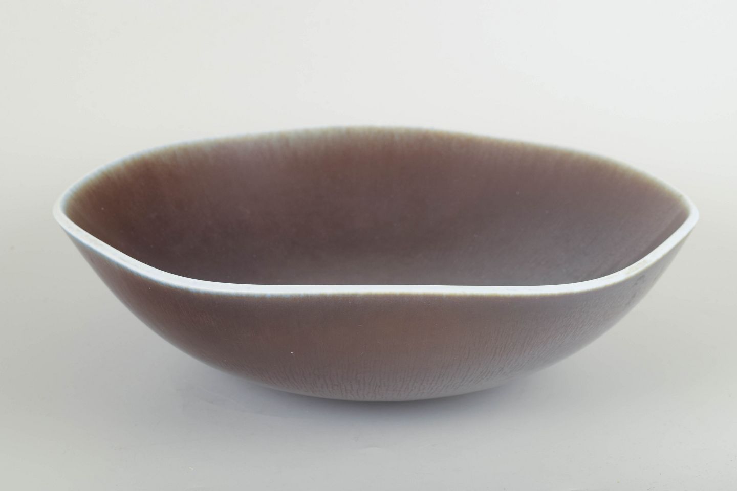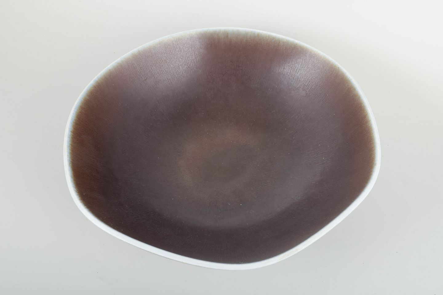 Elegant hand-thrown stoneware bowl with characteristic brown hare’s fur glaze and a finely defined white rim. The softly organic, balanced form exemplifies Friberg’s mastery of proportion and subtle surface expression. Signed ‘Friberg’ with the Gustavsberg studio mark beneath.