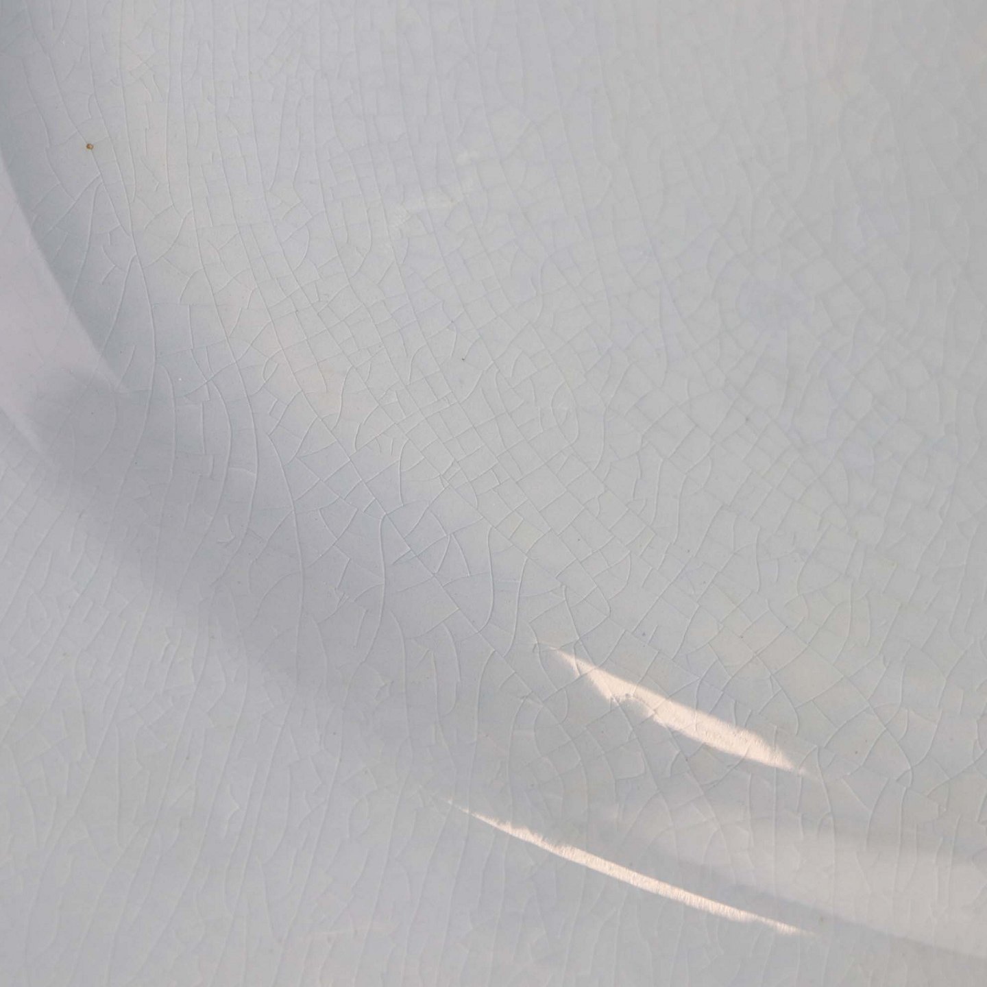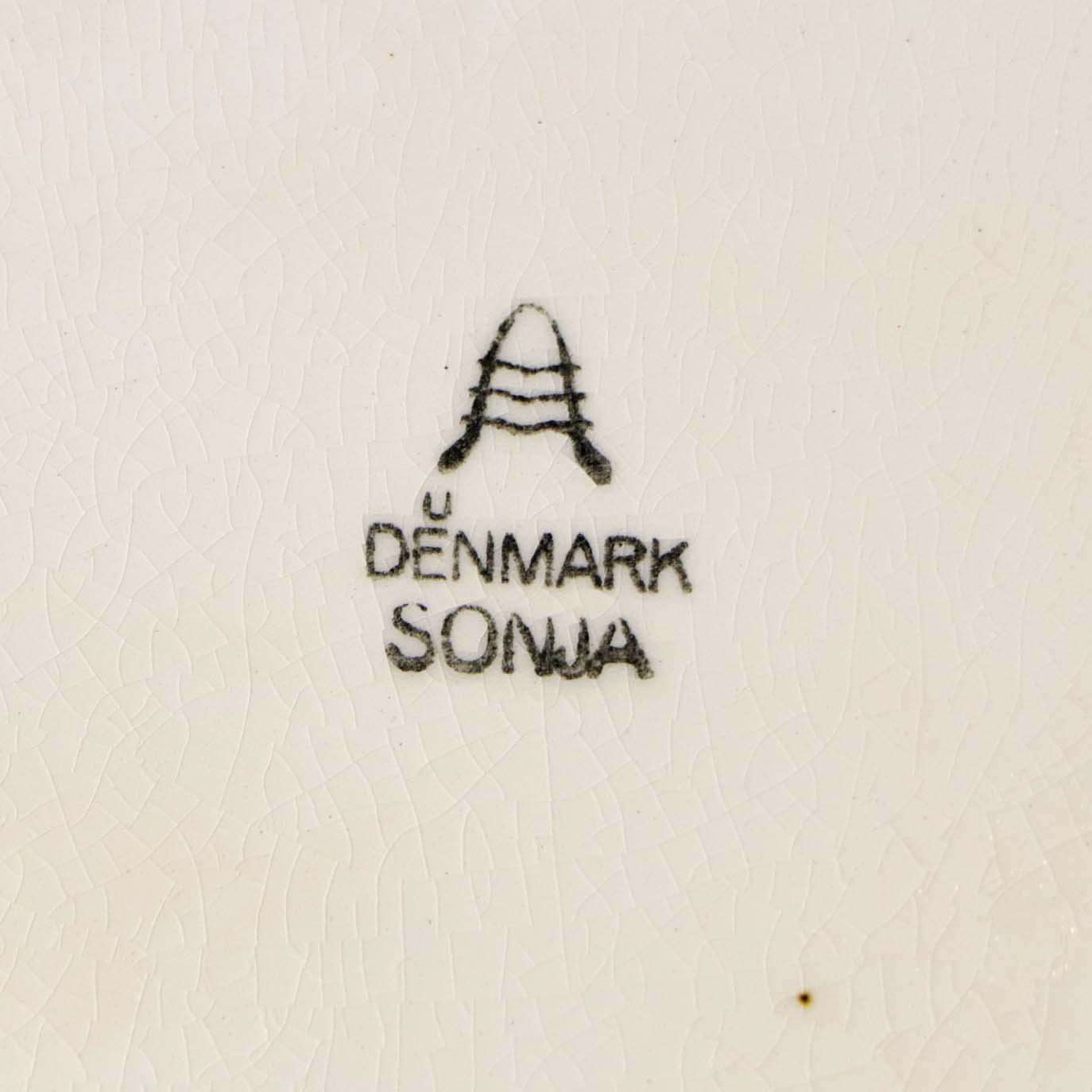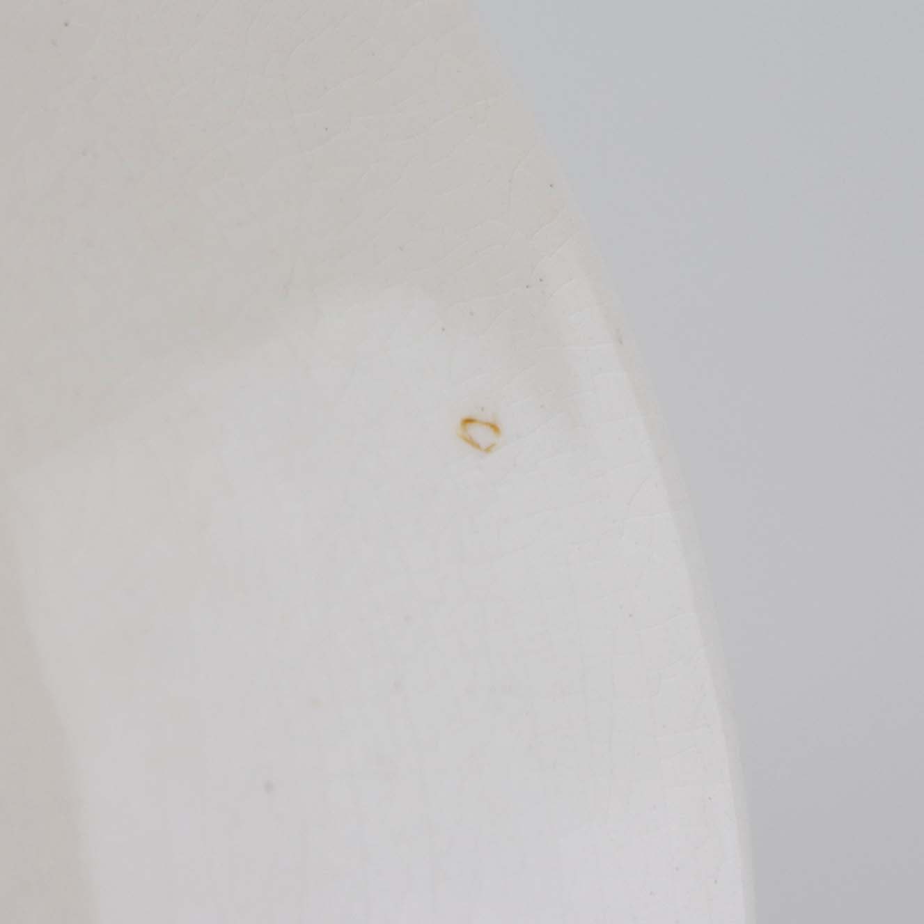 Fremstår med krakkeleringer i glasuren, uensartedhed i den hvide farve på bagsiden samt mindre brun plet.