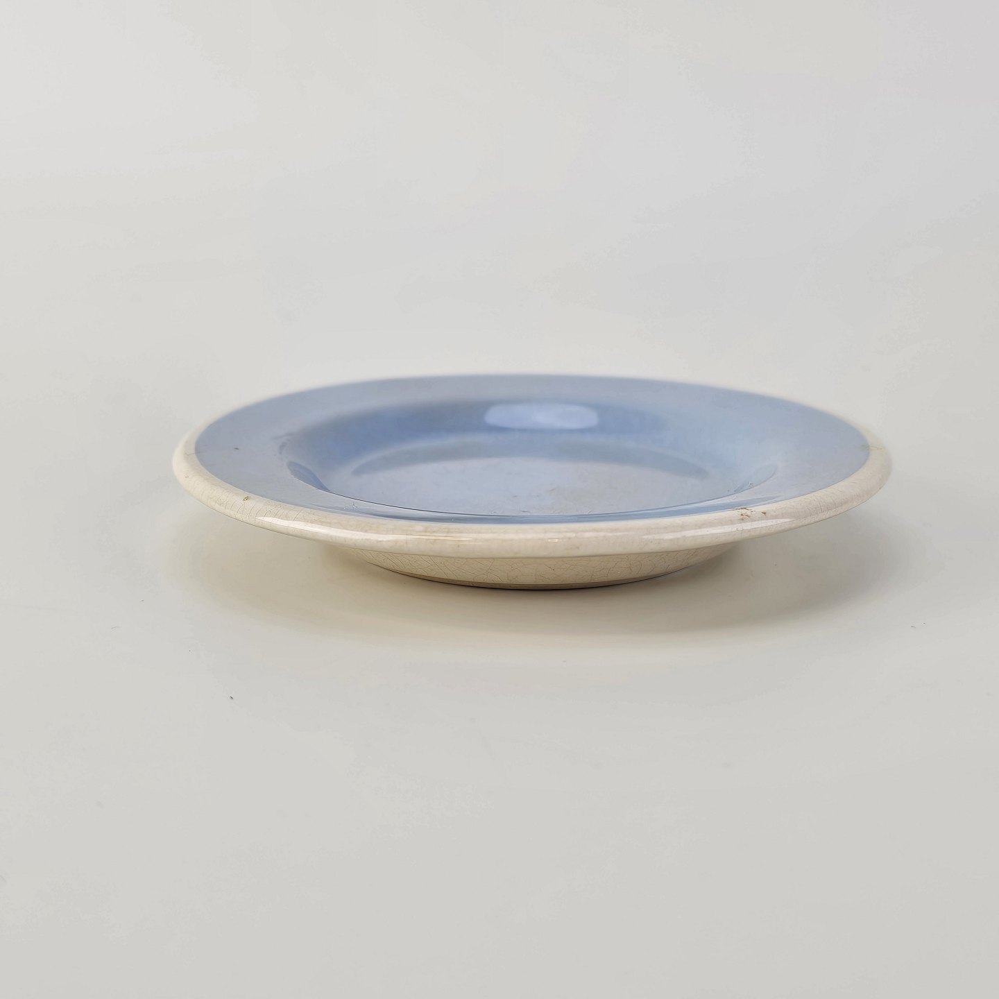 Service i lyseblå fajance dekoreret med hvid kant
