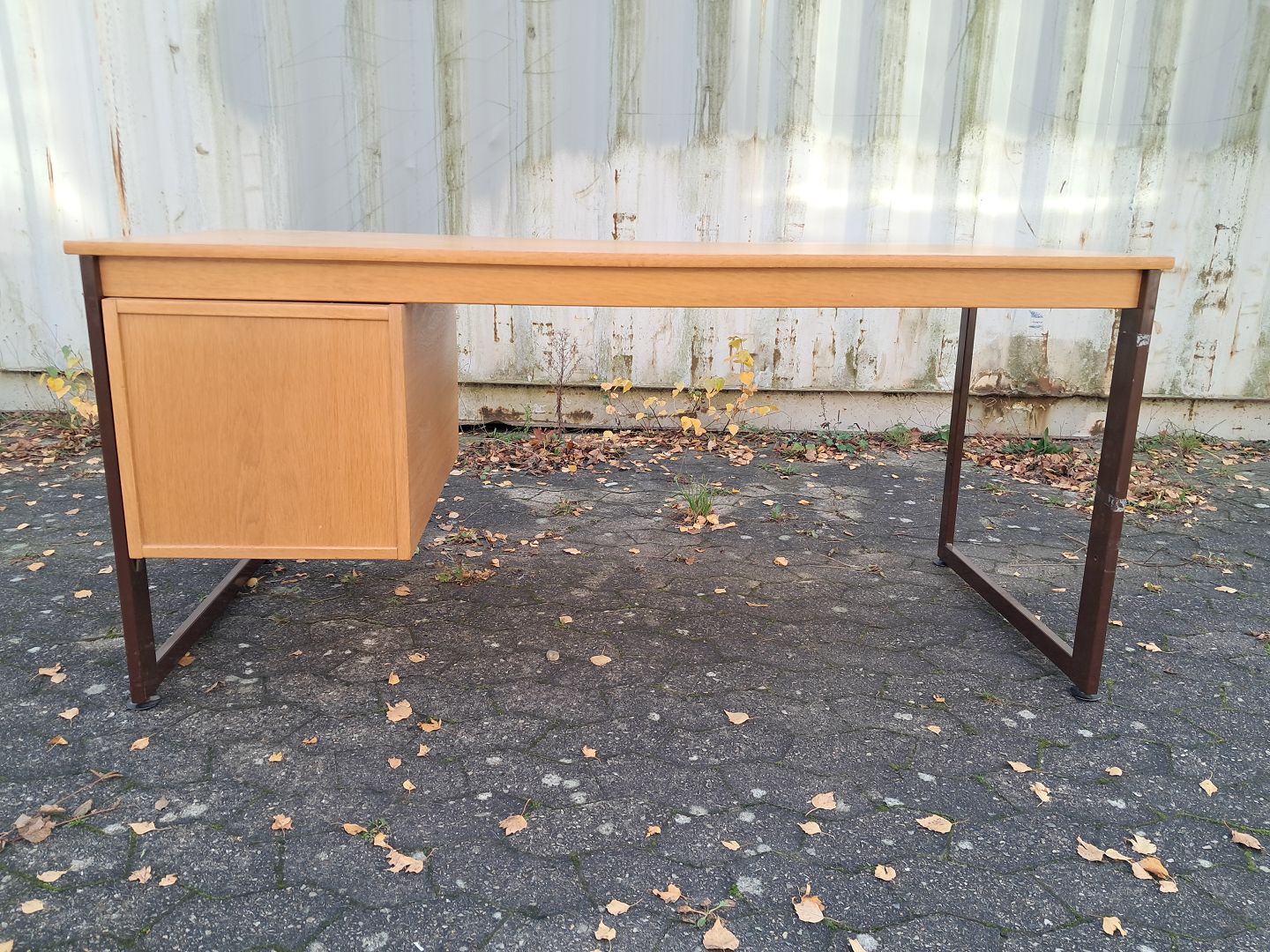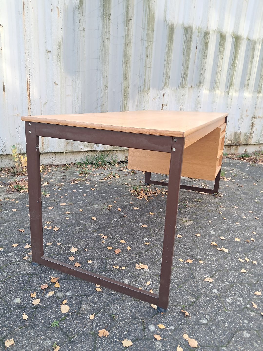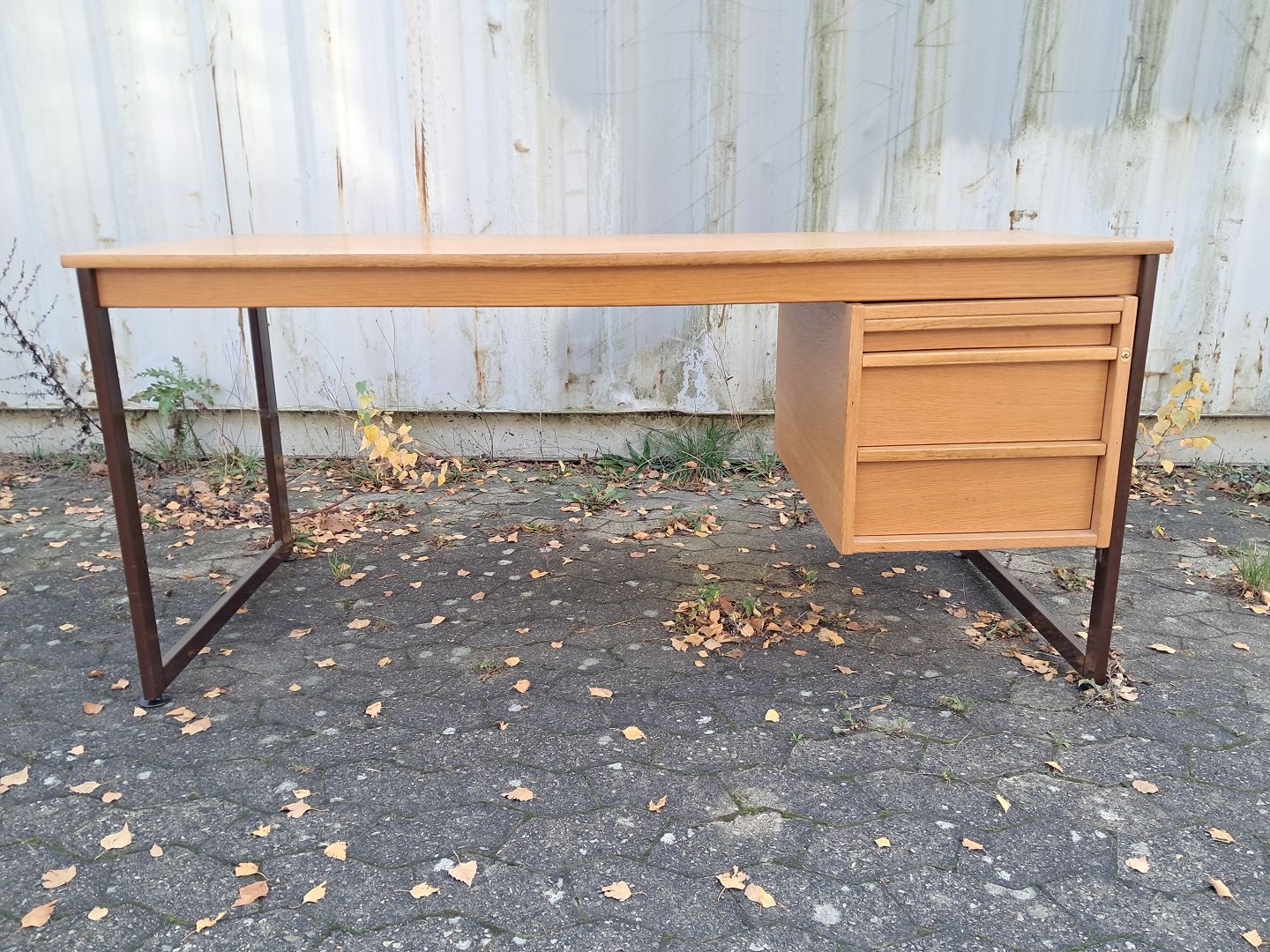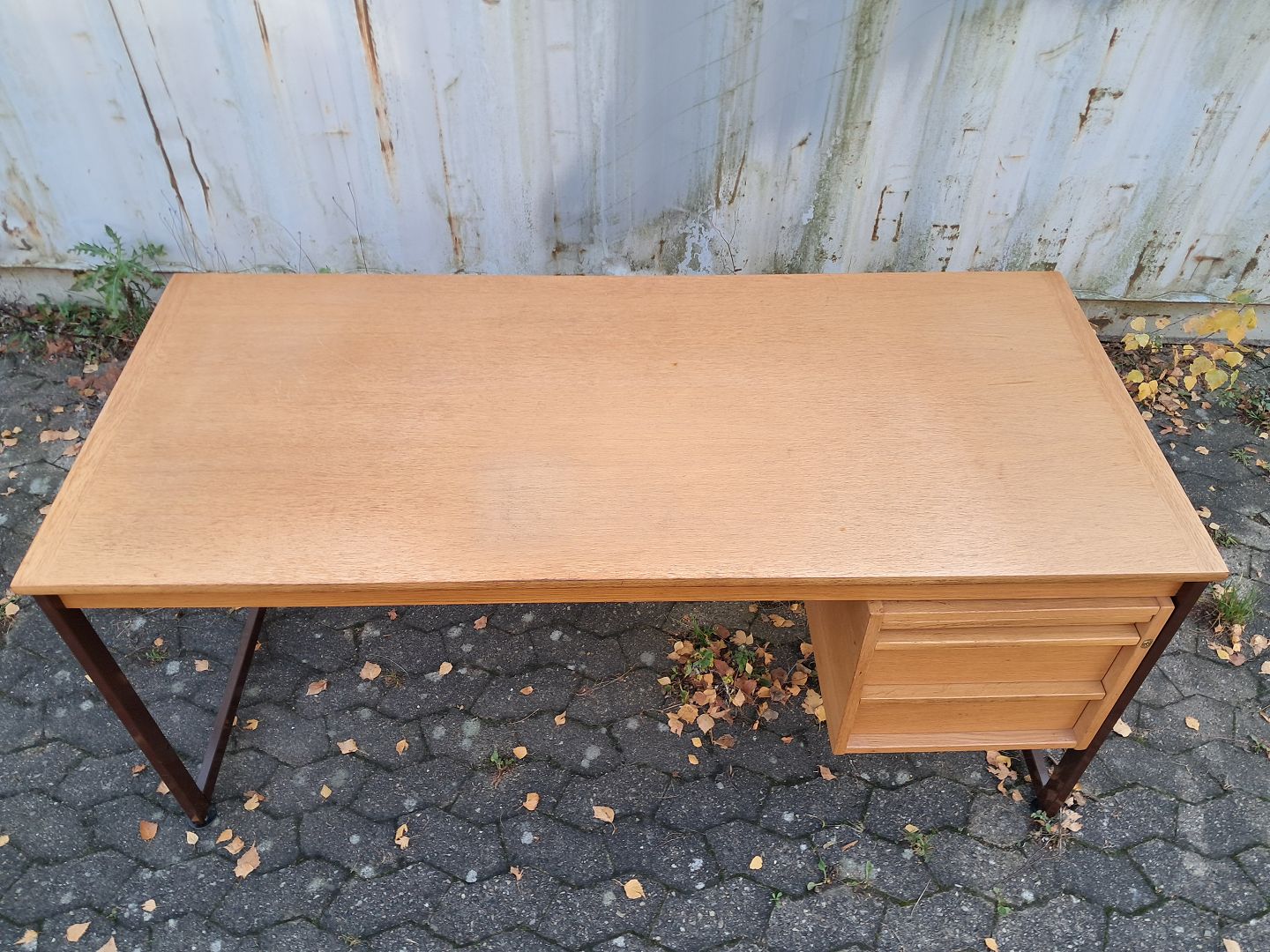 Skrivebord i fineret egetræ og metal, fra 1980erne.