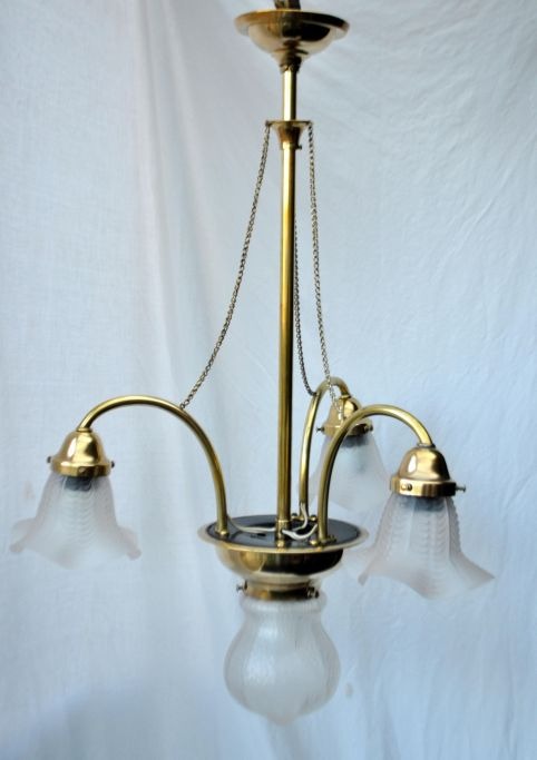 Danish Art Nouveau lamp in brass with four domes, approx. 1910. Center dome onion-shaped in frosted glass. 3 ruffled frosted lamp glasses in each light arm. With three hanging chains. H.: 80 cm. Dia.: 50 cm. All domes from Funen Glassworks. Fantastic condition. Provenance: Samsø.