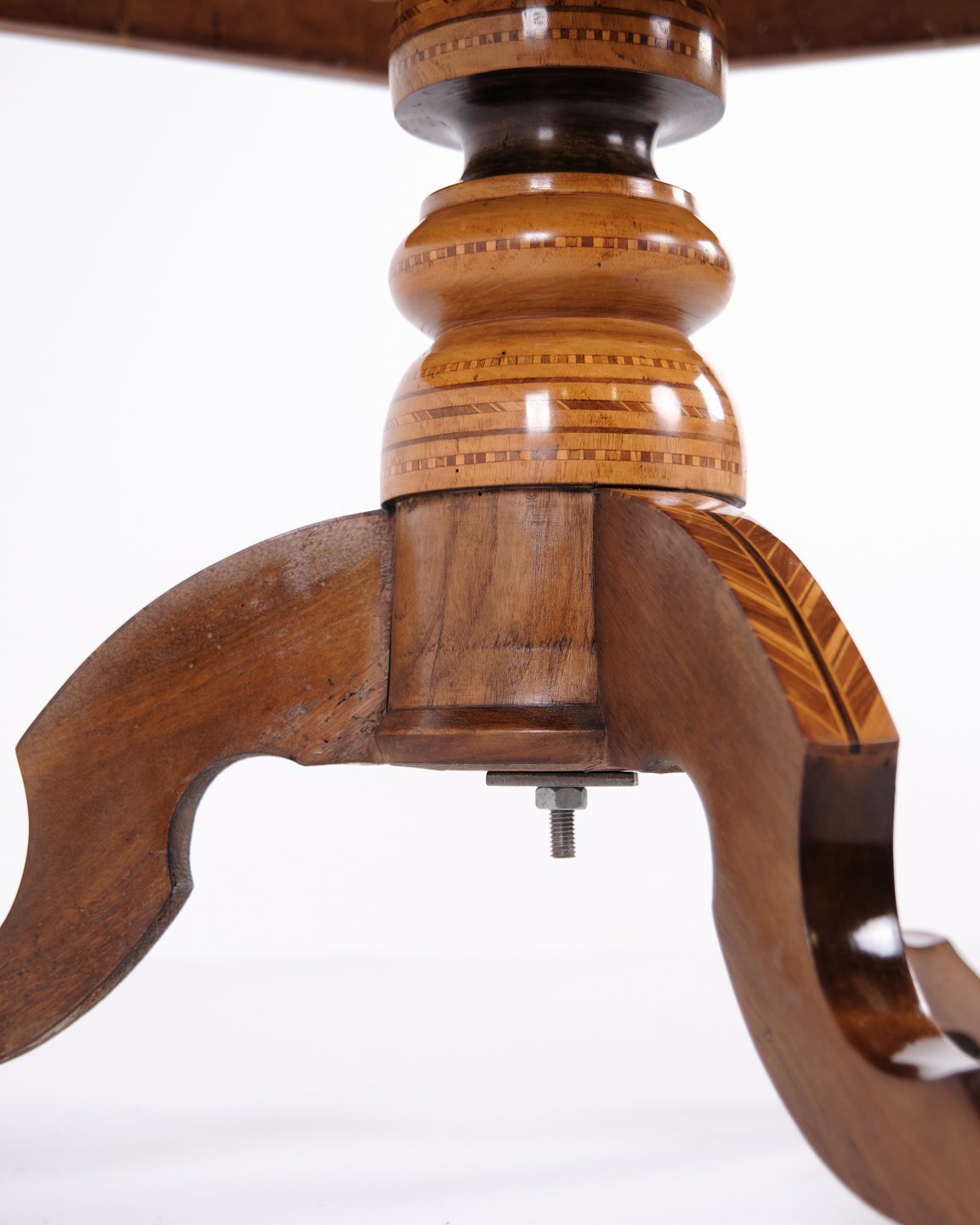 Octagonal column table from Italy, dated to the 1850s. The table is richly decorated with hand-laid intarsia, which emphasizes the geometric shapes and the overall decorative expression.