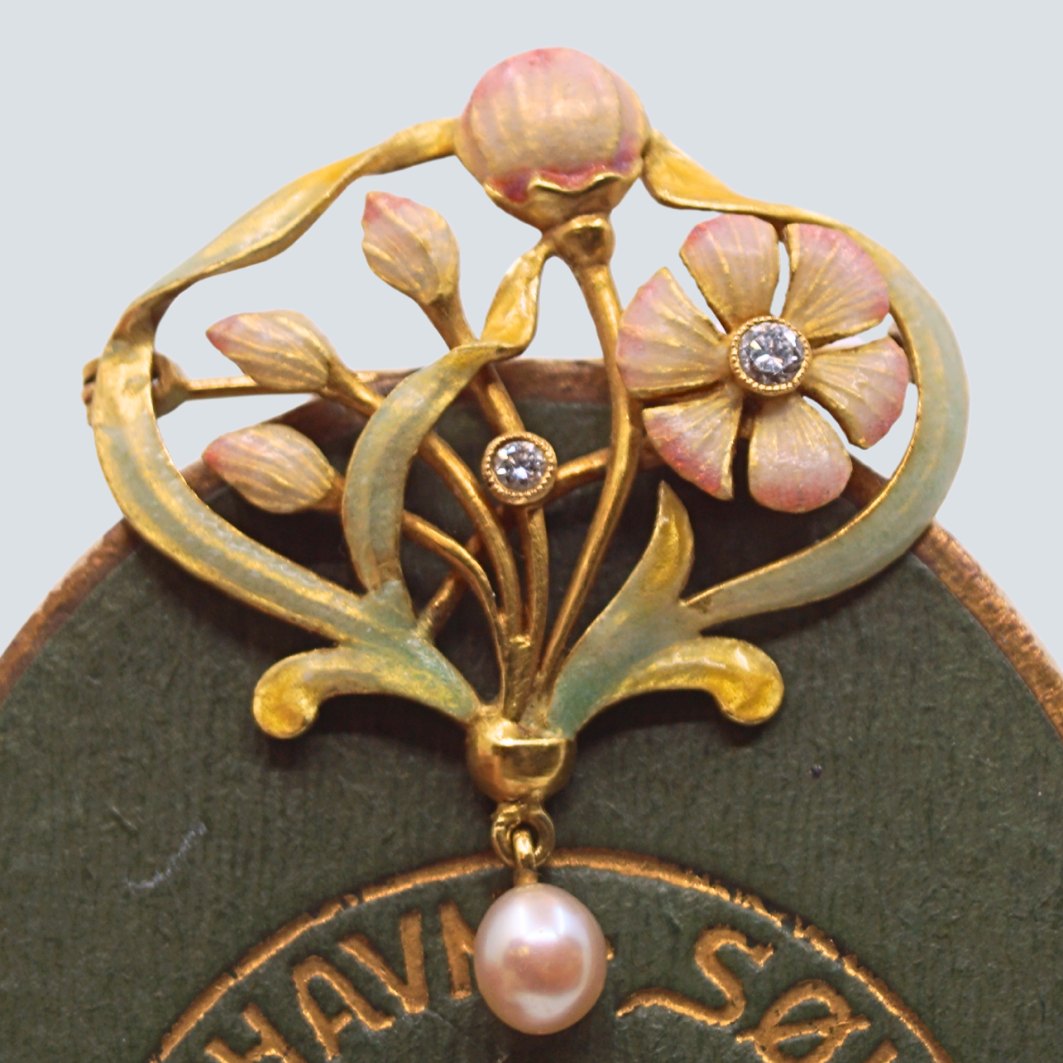 An Art Nouveau brooch in 18k gold with enamel, diamonds and pearl |