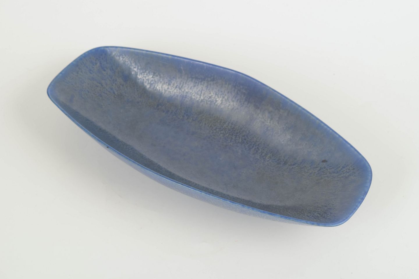 Elegant, lav skål i stentøj med bådformet profil og mat blå glasur med nuancer i kornet struktur.