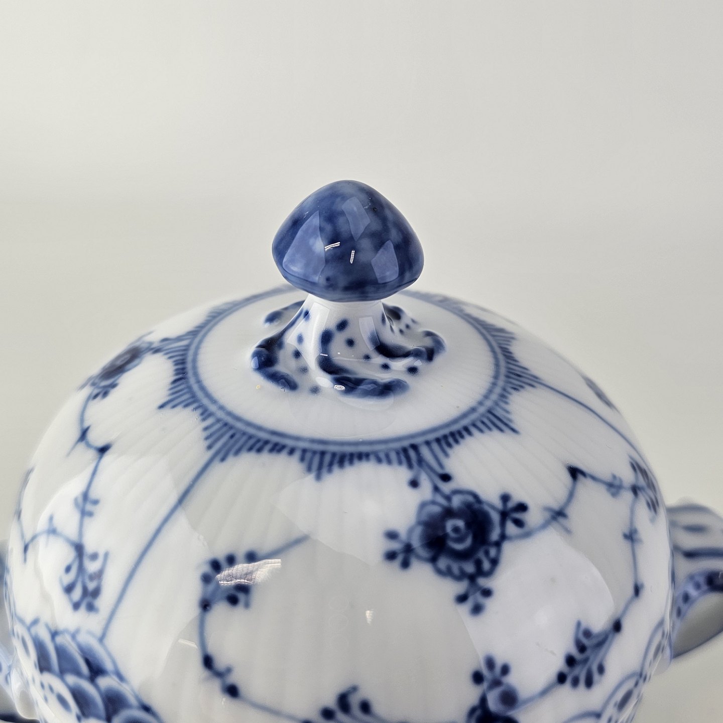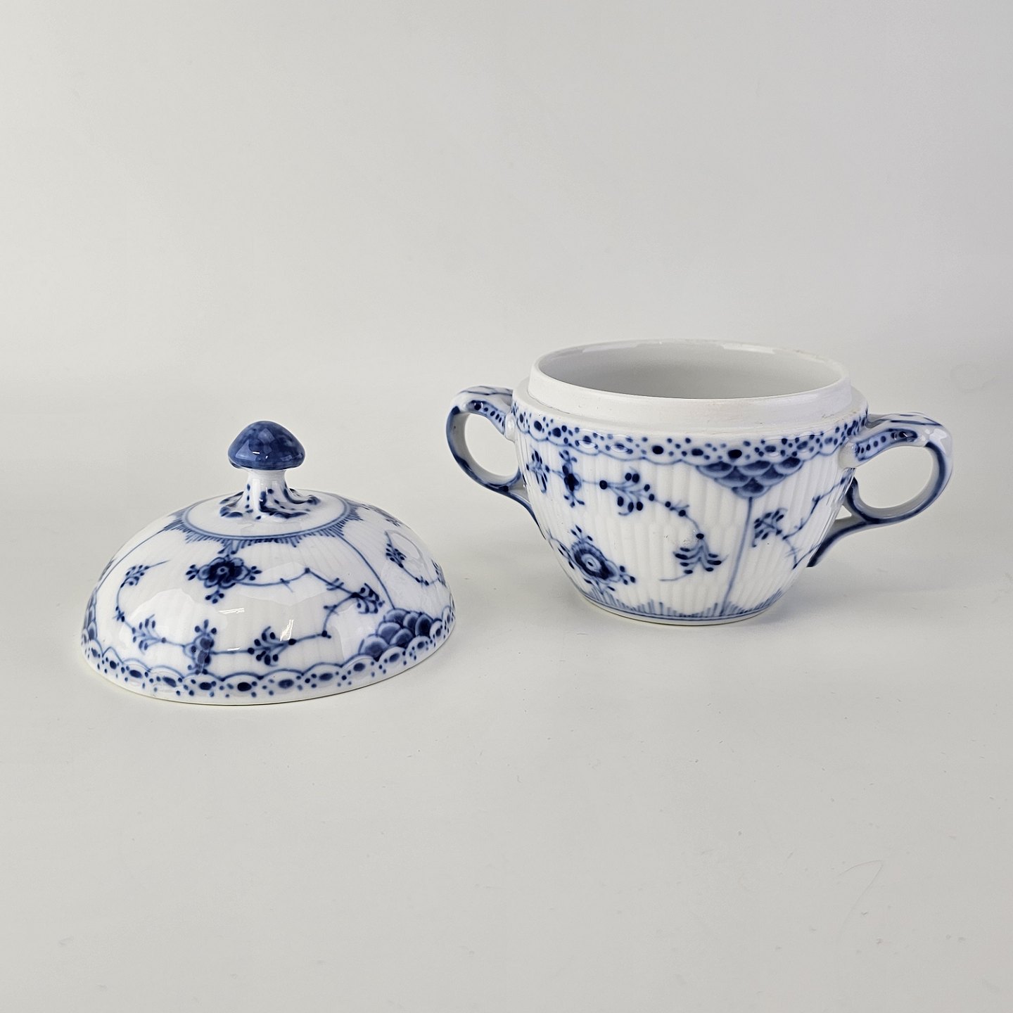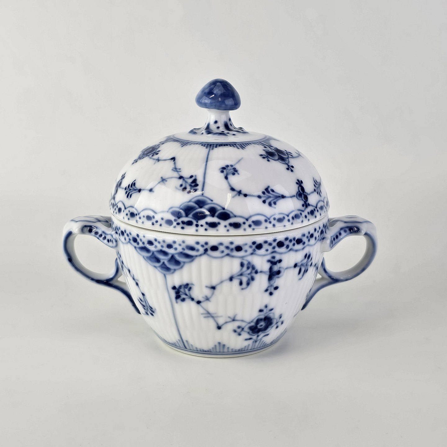 Sukkerskål i kongeligt porcelæn fra stellet Musselmalet Halvblonde