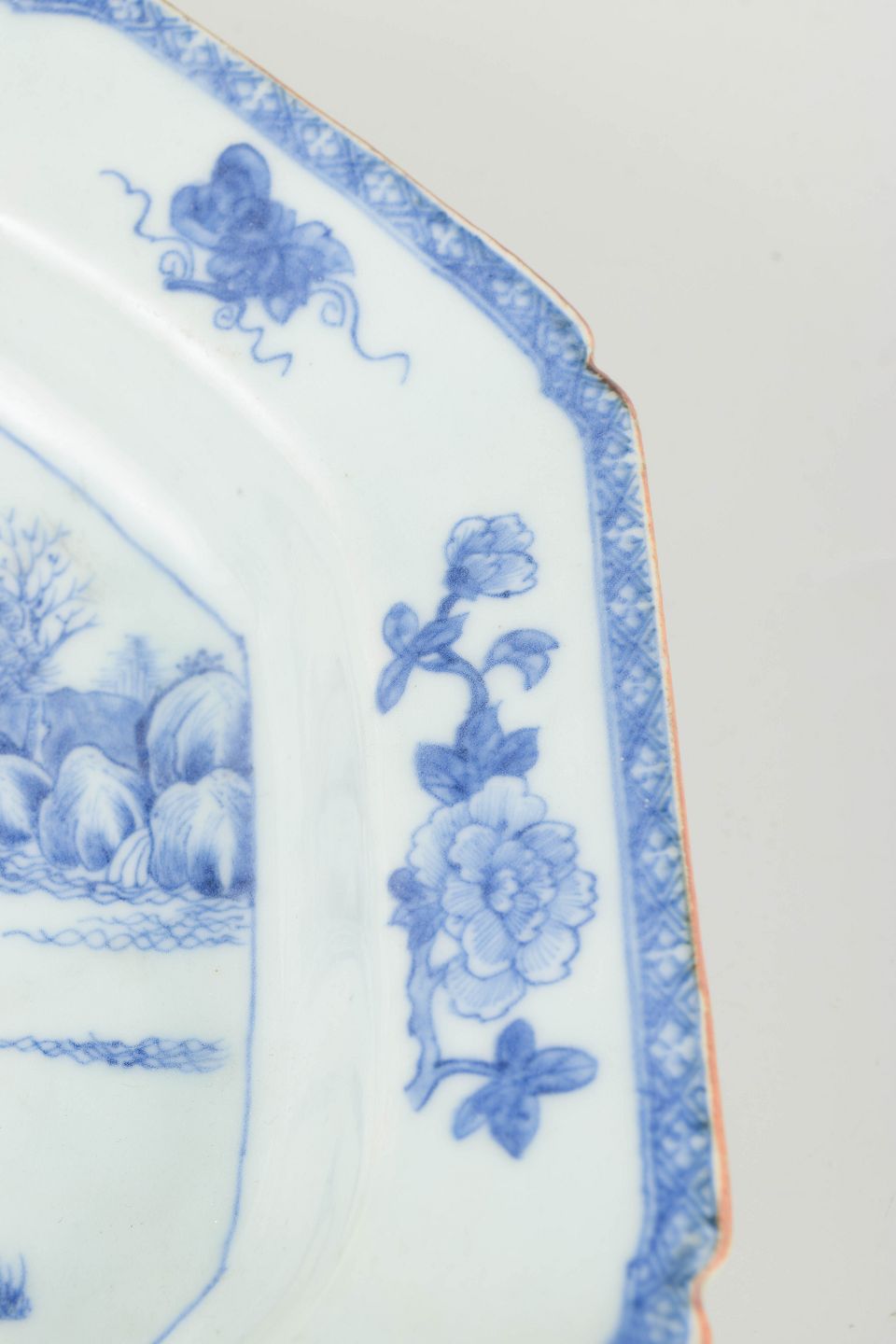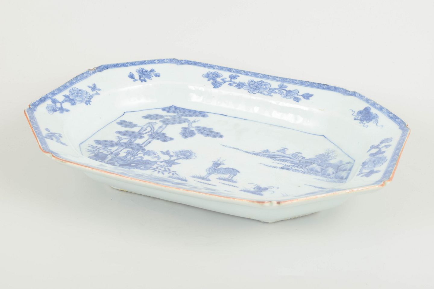 Hand-painted octagonal porcelain dish with classic blue and white decoration. The scene depicts a landscape with deer, trees, and pavilion, framed by a floral border around the rim.