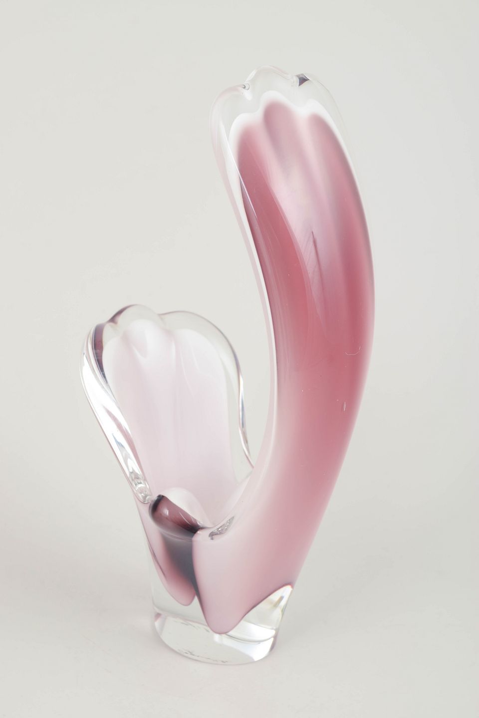 Elegant “Coquille”-form i flerlaget kunstglas med rosa til lys violet indfarvning, hvidt mellemlag og klart yderlag. Den høje, svungne, bladlignende form er typisk for Kedelvs mest organiske og skulpturelle designudtryk.