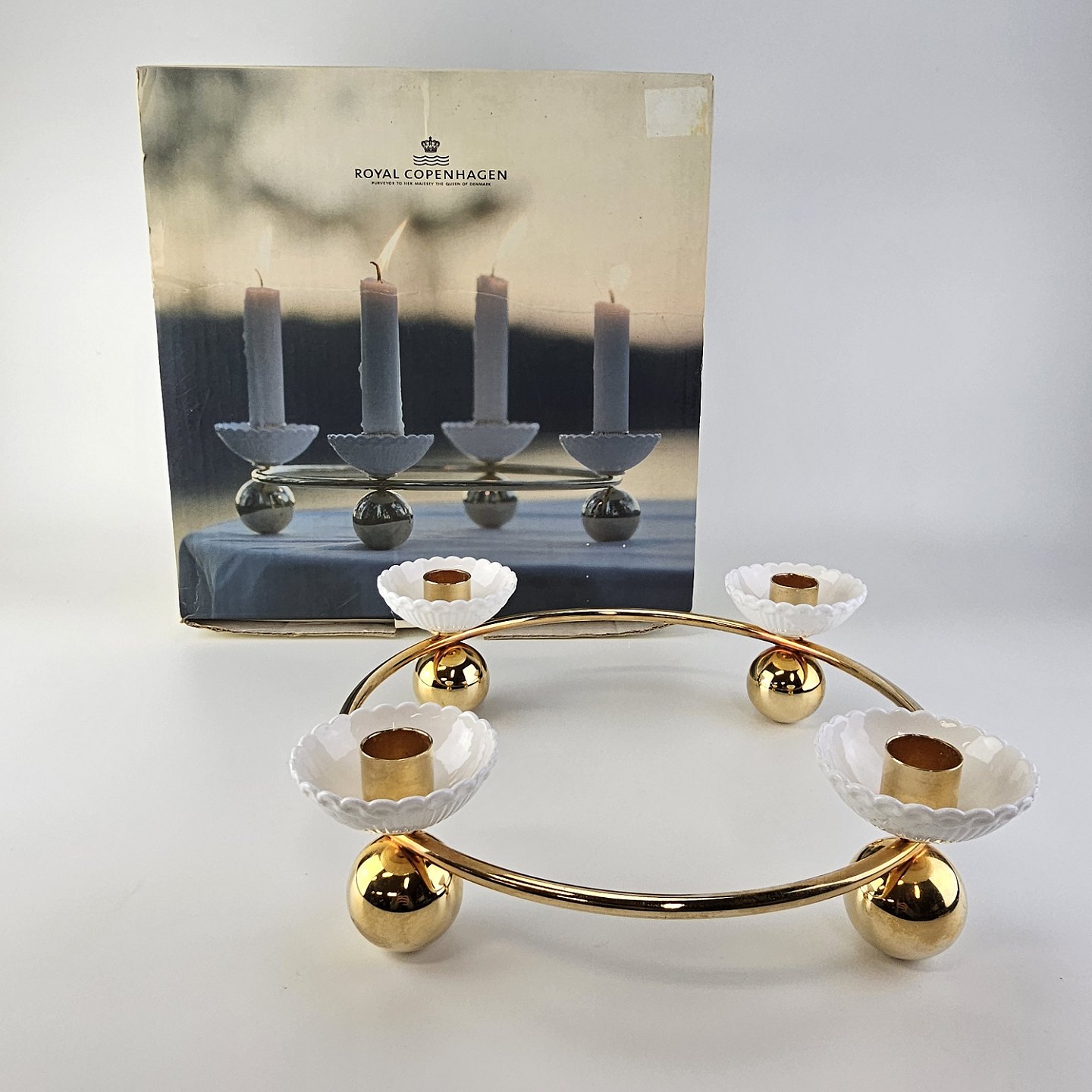 Text available in Danish: Rund lysestage i forgyldt messing med plads til fire lys i små hvide skåle af kongeligt porcelæn. Stagen er fra serien Creating Moments og kommer i original kasse