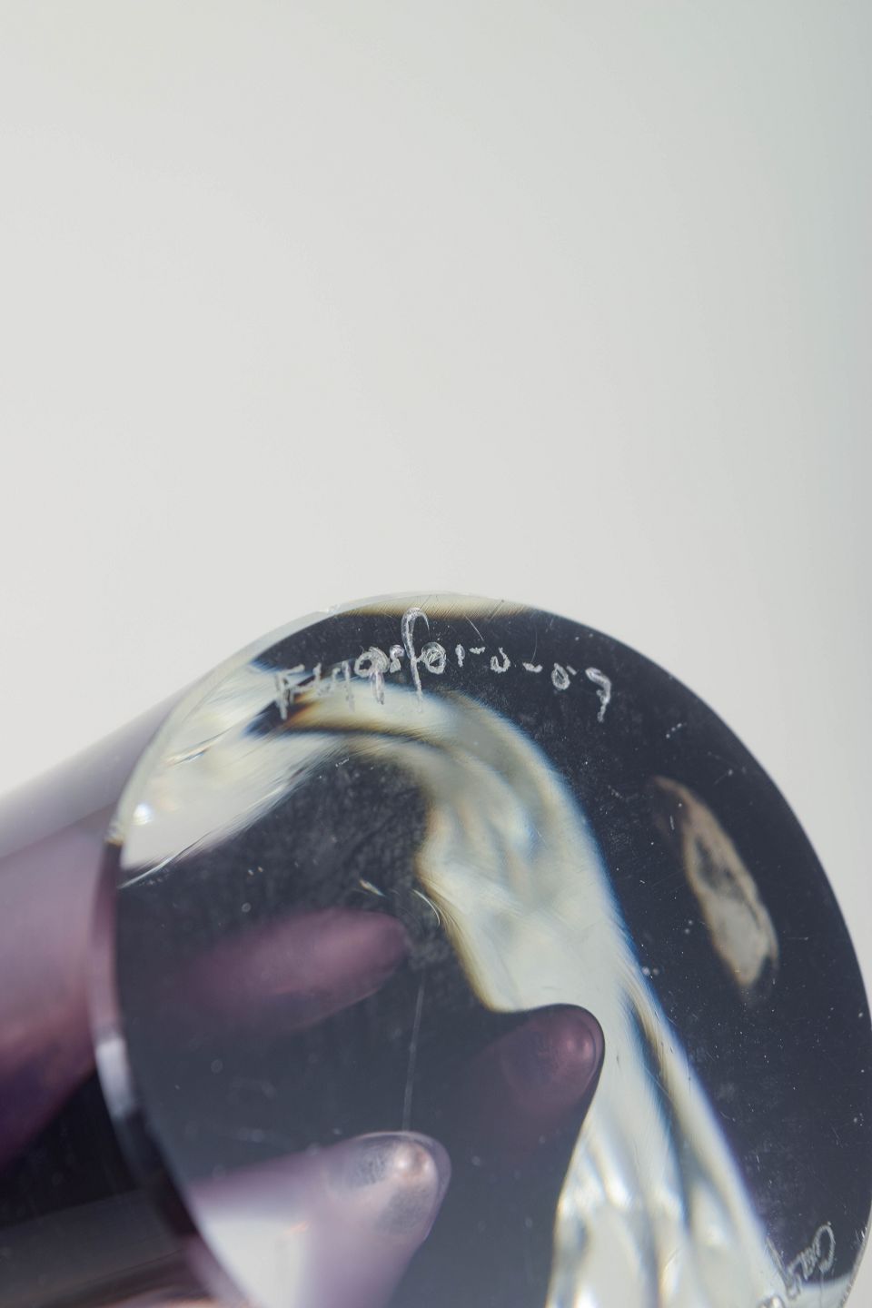Skulpturel, organisk kunstglas vase i klart glas med smukke lag i violet og hvid. Mundblæst i den klassiske opadstræbende Coquille-form, hvor de to øverste arme mødes i en elegant bue.