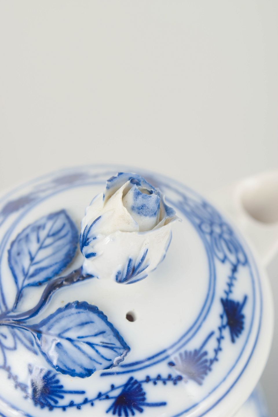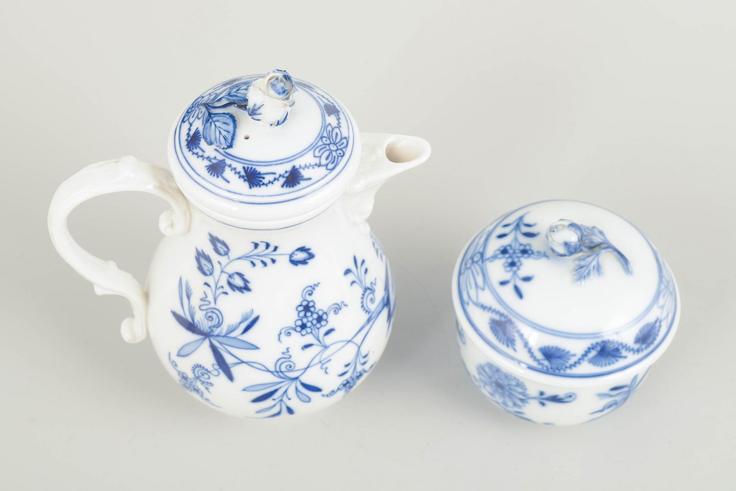 Håndmalet porcelæn fra Meissens klassiske løgmønstret serie. Sættet består af en lille sukkerskål med låg samt en elegant mokkakande med låg og hank. Begge dele er smukt dekoreret med de karakteristiske blå blomster- og rankemotiver.