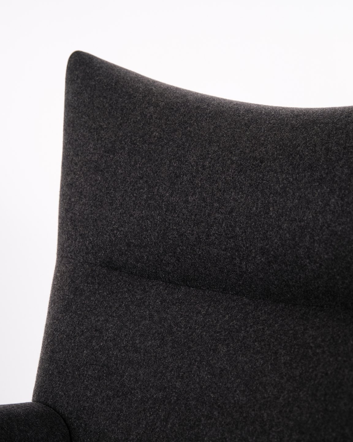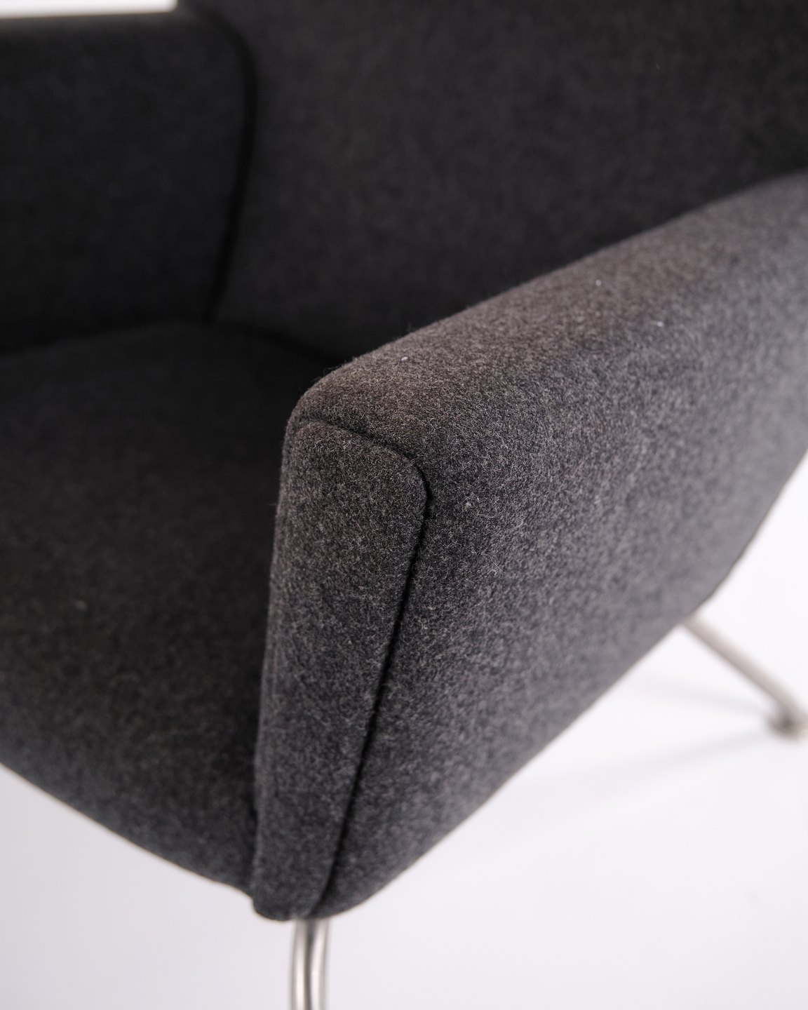 Wingchair CH445 designet af Hans J. Wegner og produceret af Carl Hansen & Søn. Udført i gråt Hallingdal-stof med tilhørende skammel i samme polstring. Klassisk Wegner-model med høj ryg, markante vinger og solid komfort. Et anerkendt dansk designikon.
