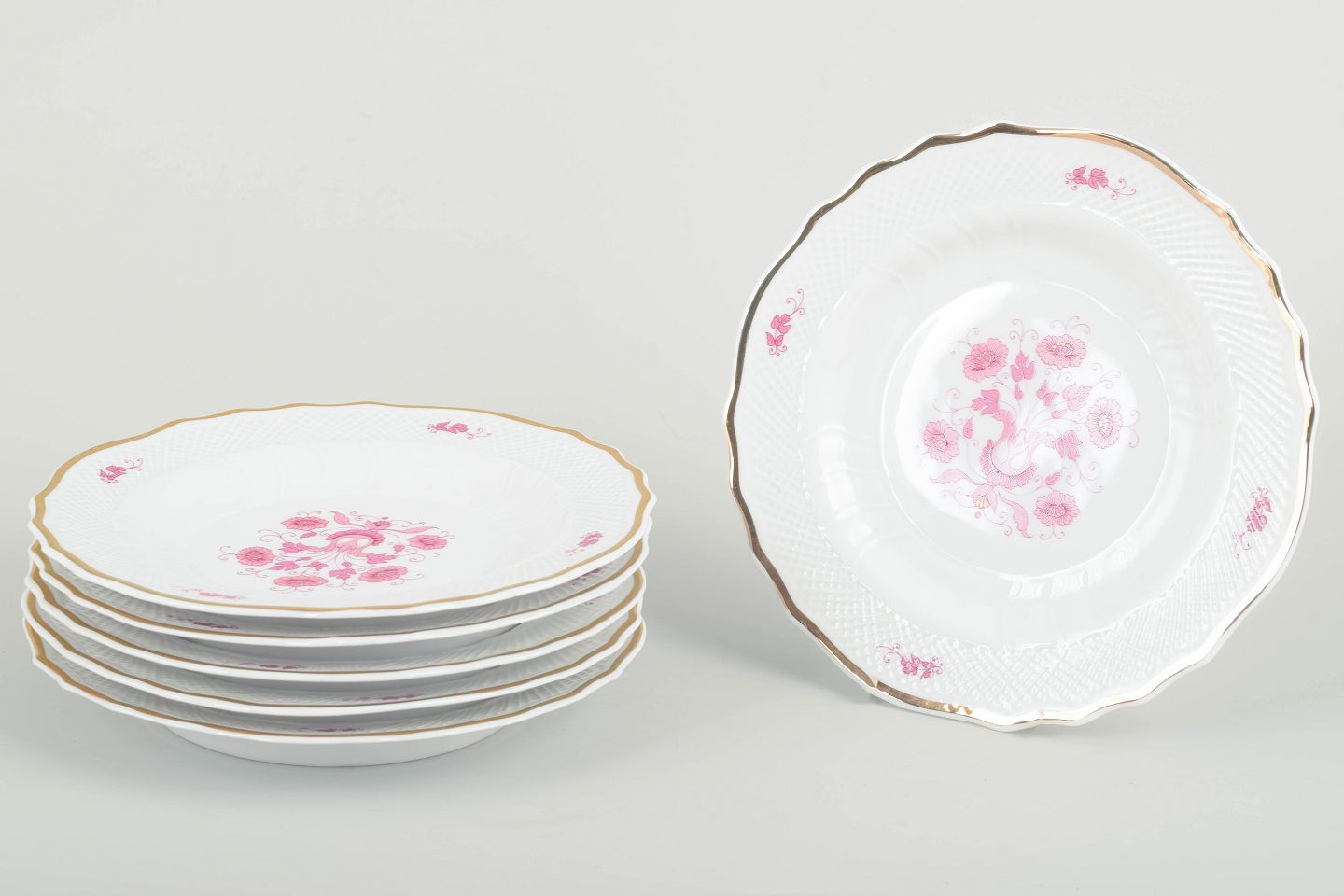 Sæt med seks fine tallerkener i porcelæn med lyserød blomsterdekoration og guldkant. Klassisk og elegant udførelse fra den ungarske porcelænsfabrik Hollóháza.
