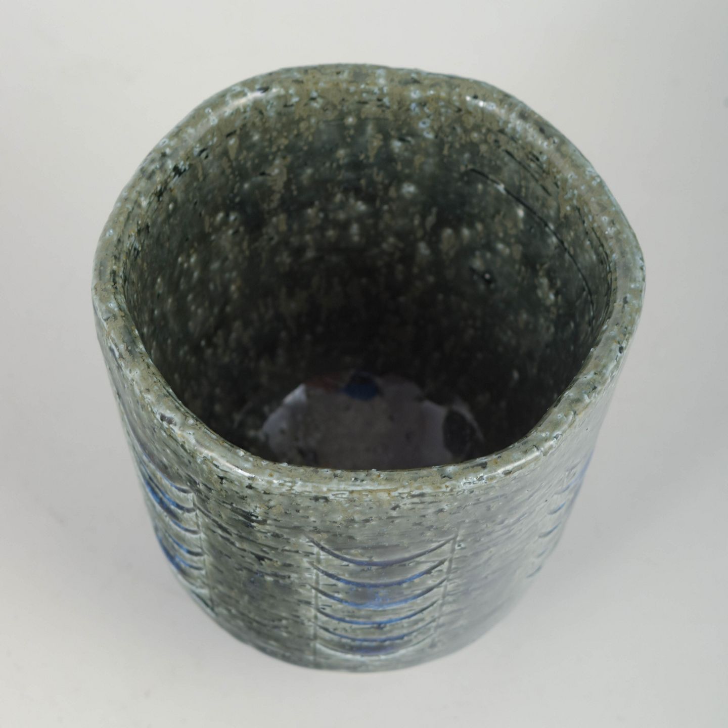 Lille cylindrisk vase i stentøj med indskårne buemotiver i blå nuancer og karakteristisk Palshus askeglasur. Signeret.