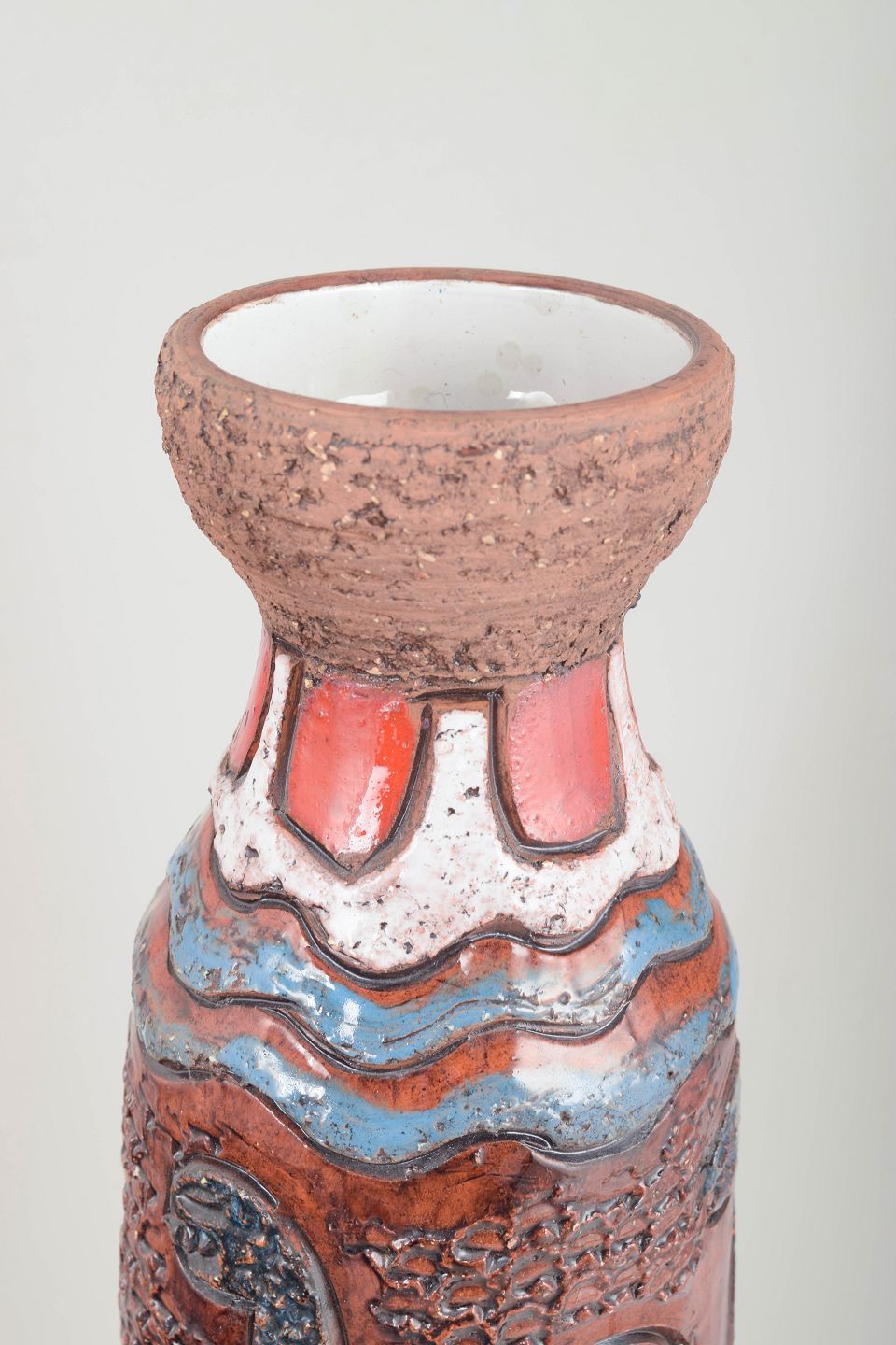 Imponerende chamotte-gulvvase med kraftigt modelleret relief og dekorativ glasur i rødbrune, blå, turkise og hvide nuancer. Forsiden prydes af stiliserede, opstigende drageformer – et karakteristisk motiv for Zawadzkis arbejde i 1960’erne.