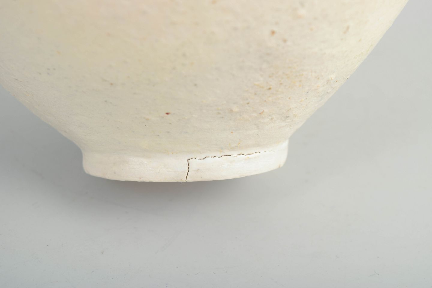 Skulpturel, håndbygget studiovase i stentøj med let asymmetrisk form, rå hvid overflade og minimalistisk penselstrøg-dekor i mørke brune og sorte nuancer.