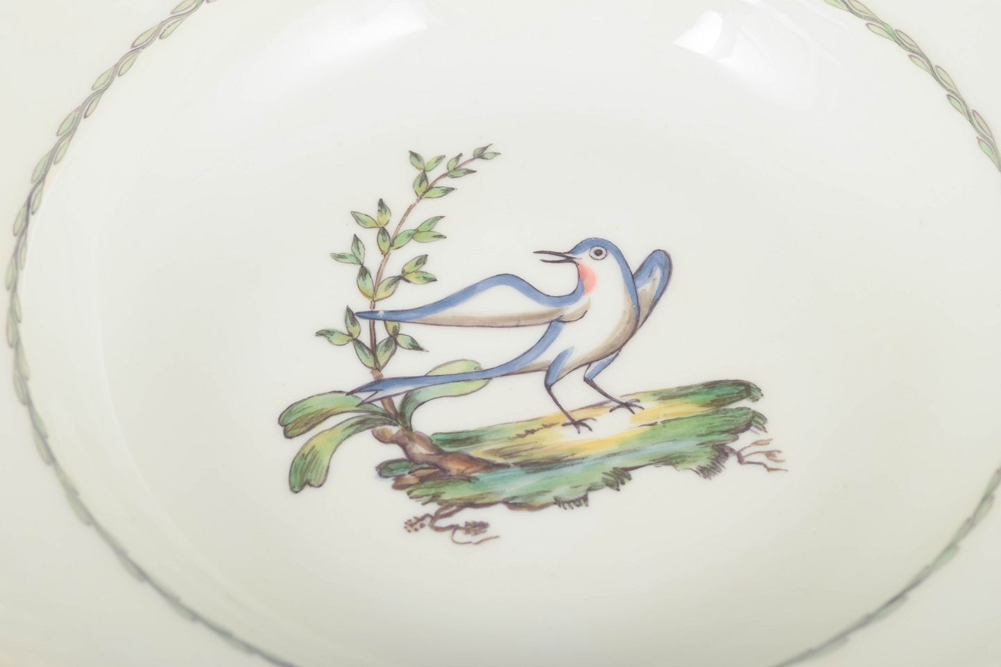 Sjældne dybe tallerkener i porcelæn fra Royal Copenhagen med motiv af fugle og botaniske elementer (model 550/8107). Hver tallerken er kantet med guldrand og har et elegant, let riflet fletrelief langs kanten.