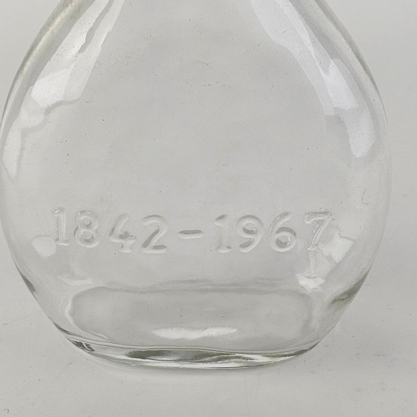 Brændevinsflaske med korkprop og teksten 1842-1967