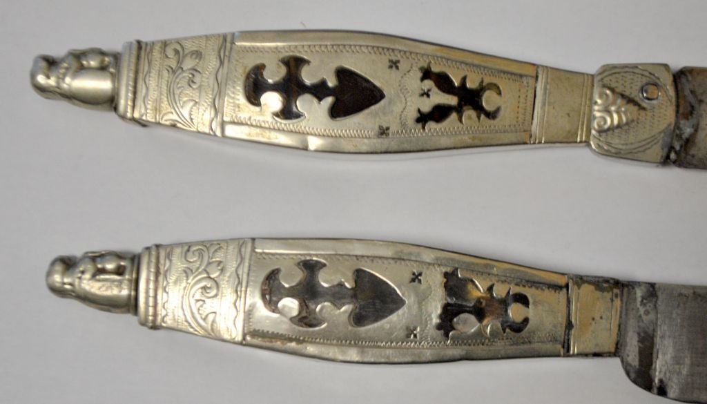 Hollandsk renaissance sølv bestik , 17. årh. Klinge af stål. Skæft med indlægninger af skildpadde. Øverst figur af løve med Amsterdams våbenskjold. L.: 22 cm. & 22,5 cm.