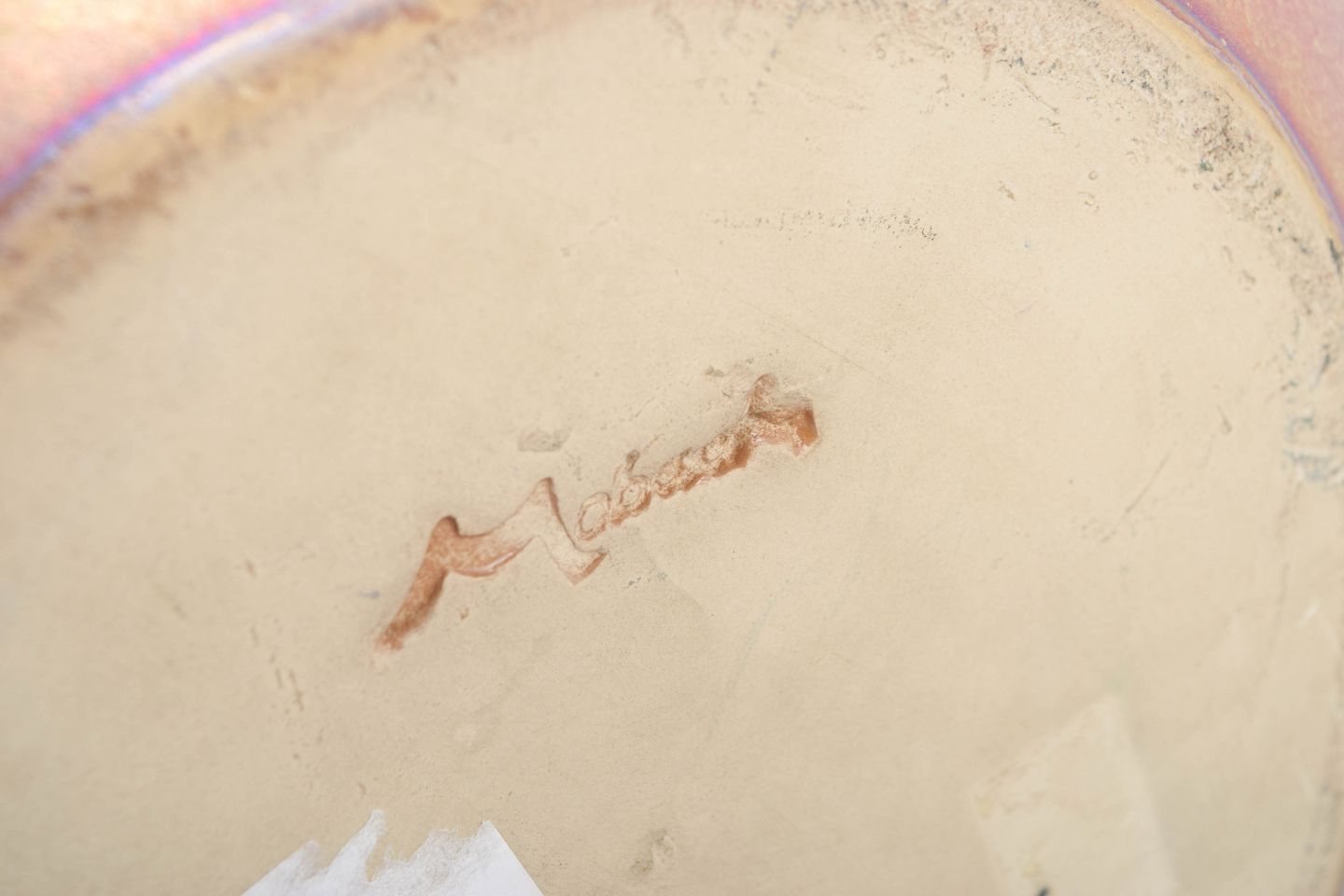 Håndlavet, monumentalt formet vase i keramik med iriserende, perlemorsskinnende overflade i bløde rosa- og guldtoner. Den sfæriske form og den lille, let markerede hals giver vasen en skulpturel og harmonisk fremtoning – karakteristisk for Mobachs håndværksmæssige tradition.