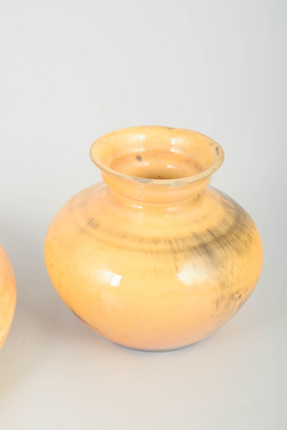 Et sæt bestående af et lavt rundt fad og en lille vase, begge i den karakteristiske orange-gule uran-glasur typisk for Kähler i 1930’erne. Fadet har en blød afrundet kant og levende farvespil, mens vasen har klassisk form med smallere hals og fyldig korpus.