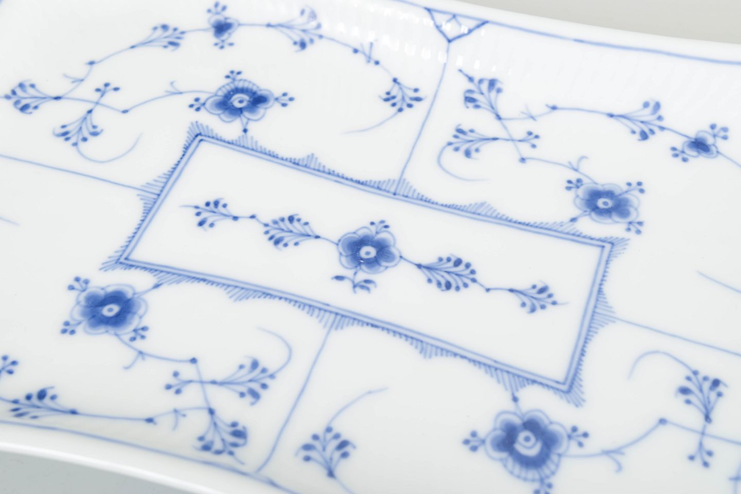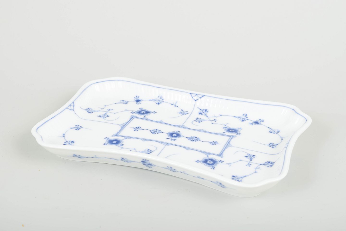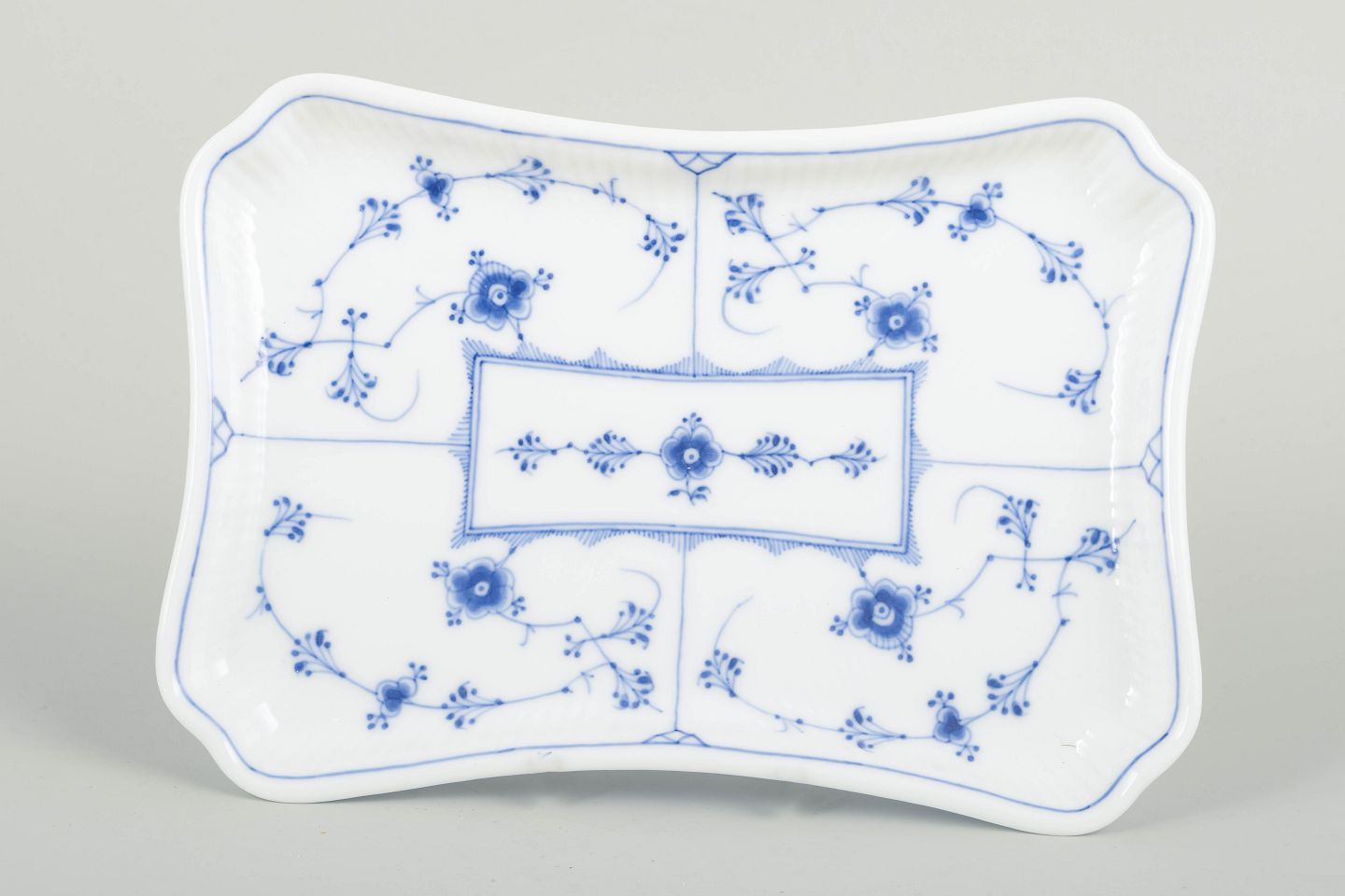 Elegant rectangular tray in the Blue Fluted Plain porcelain series, featuring softly curved edges and classic hand-painted cobalt-blue decoration on a fluted body. A beautiful and less common form from Royal Copenhagen’s early 20th-century production.