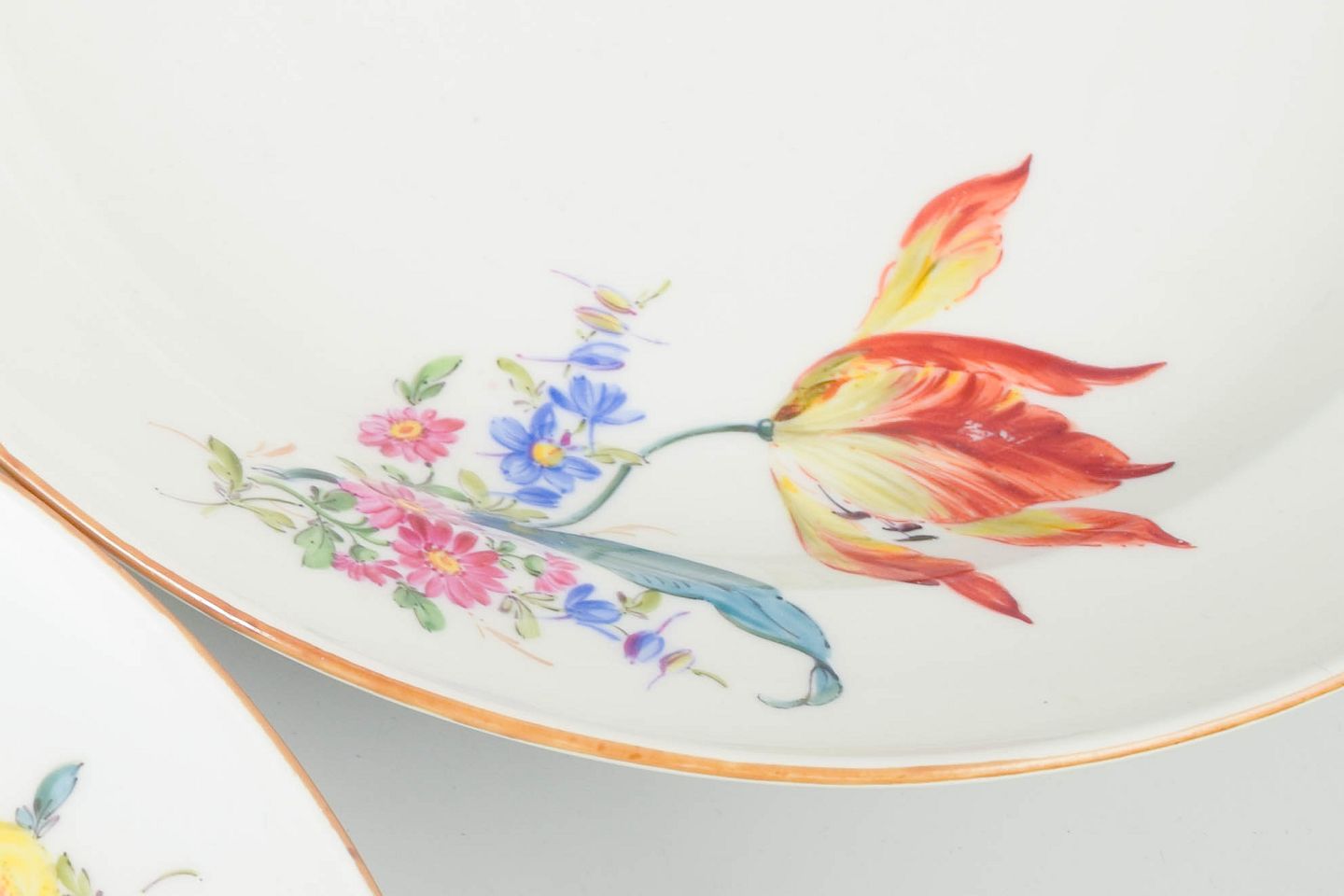 Hand-painted porcelain plates with colourful floral motifs in classic Meissen style. Elegant composition with slightly asymmetrical placement of the decorations.