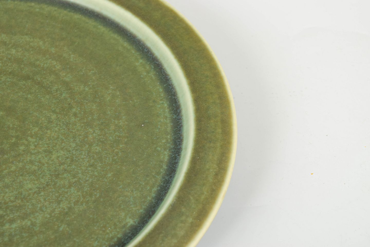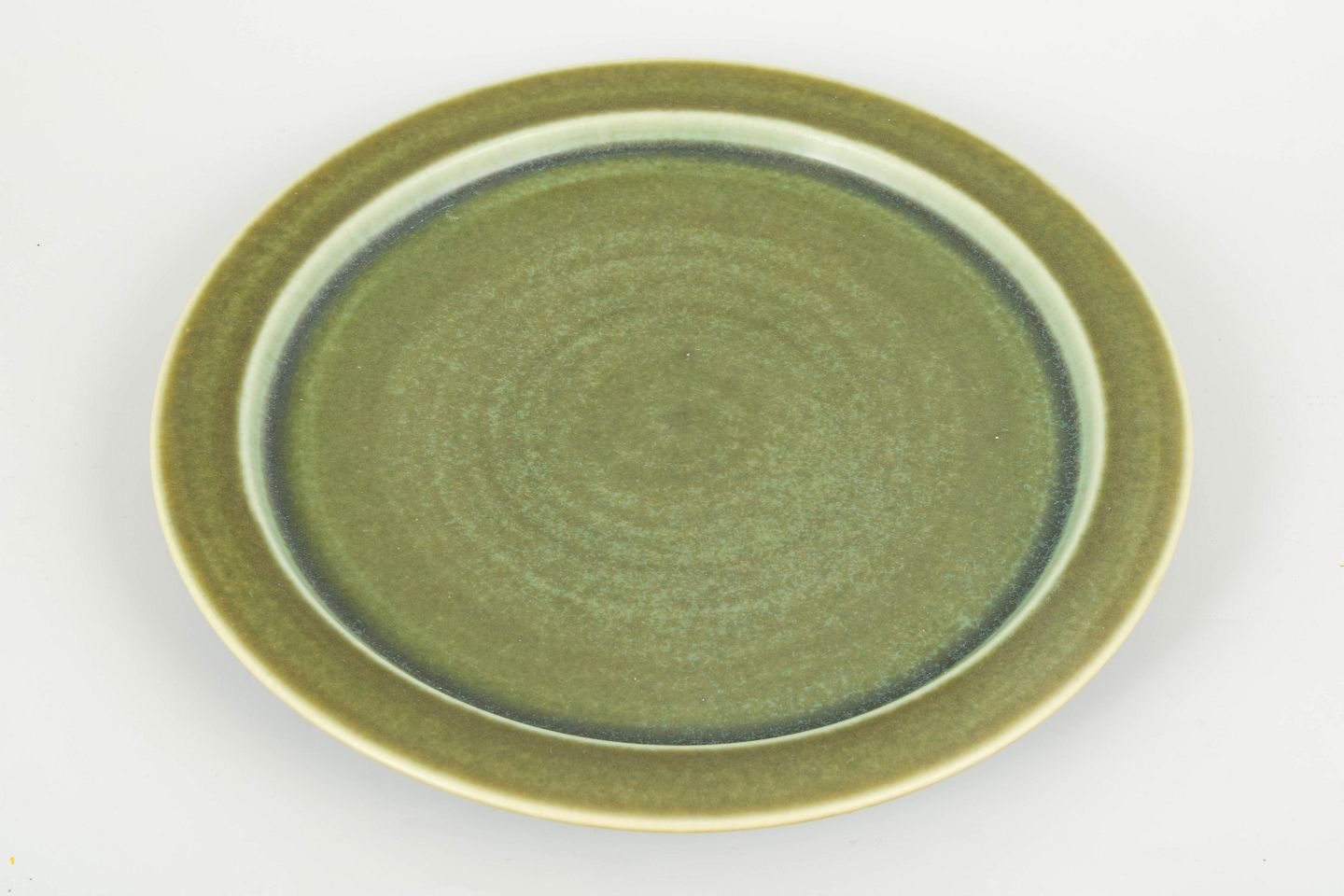 Large, simply shaped stoneware dish in the classic Saxbo style, featuring the characteristic matte, nuanced green glaze. The calm form and deep tonal quality reflect the workshop’s refined modernist aesthetic.